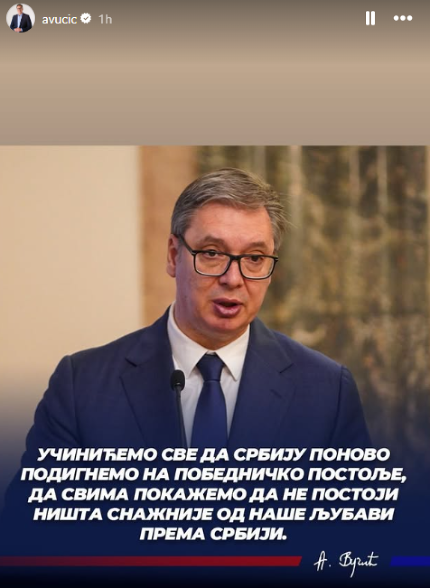 - Učinićemo sve da Srbiju ponovo podignemo na pobedničko postolje, da svima pokažemo da ne postoji ništa snažnije od naše ljubavi prema Srbiji - saopštio je predsednik Srbije.