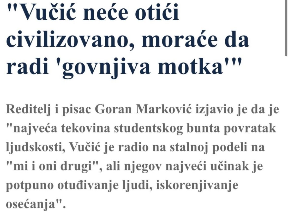 Naime, član pokreta Proglas Goran Marković, preko tajkunskih glasila, preti građanskim ratom, kako bi se dokopao fotelje i privilegija na koje je navikao tokom komunističke Jugoslavije.