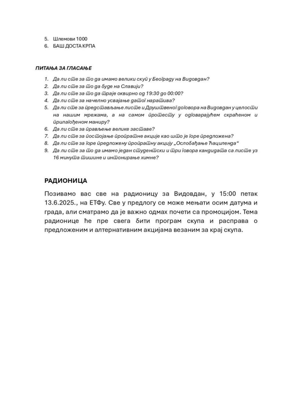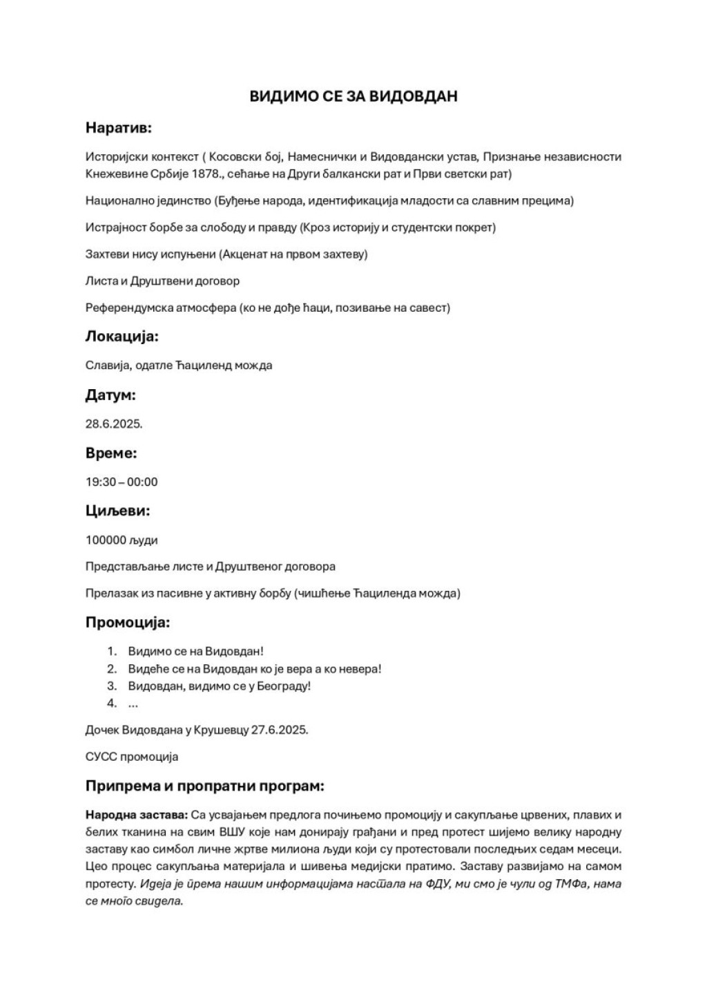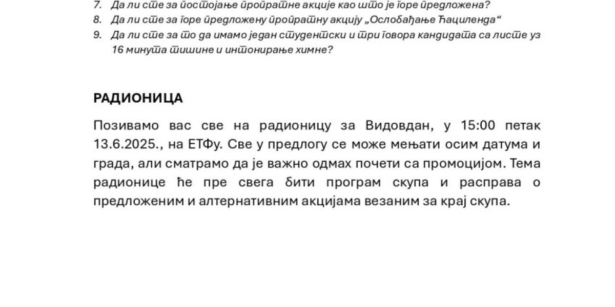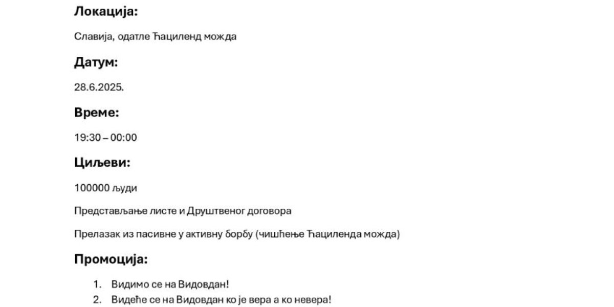 "Poziv na oslobađanje Ćacilenda: 48 sati ranije obaveštavamo javnost da ćemo za Vidovdan osloboditi Ćacilend, te pozivamo da se do 21.00 28. juna svi rezidenti Ćacilenda koji ne žele da u miru, zajedno sa nama stanu pod jednu, narodnu zastavu, povuku iz Pionirskog parka i sa platoa ispred Skupštine Srbije", navodi se u dokumentu.