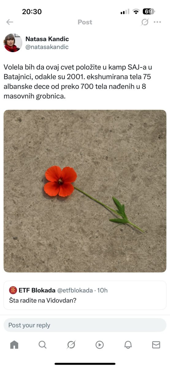 - Volela bih da ovaj cvet položite u kamp SAJ-a u Batajnici, odakle si 2001. godine ekshumirana tela 75 albanske dece od preko 700 tela nađenih u 8 masovnih grobnica - poručila je Kandić na "Iksu".