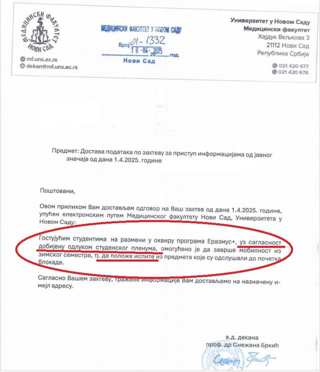 Dekanka Snežana Brkić, inače, jedna je od glavnih blokaderka u Novom Sadu. Da je to tako, pokazuje dokument do kojeg smo došli, a u kojem se navodi da je Brkićeva, "u dogovoru sa plenumom", gostujućim - dakle, studentima iz inostranstva - omogućila da završe zimski semestar!?!
