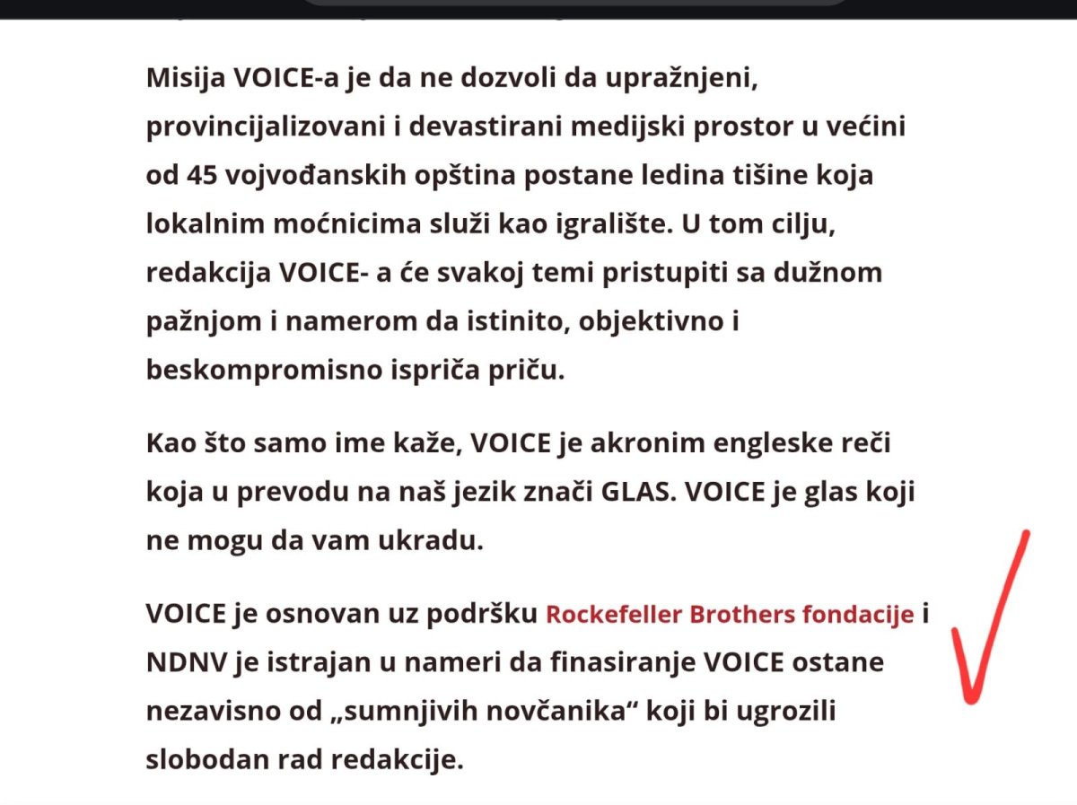 Uz malo istraživanja po njihovom sajtu može se videti da je VOICE osnovan uz podršku fondacije braće Rokfeler. Sad kad je jasno ko ih zapravo finansira i po čijoj direktivi rade. Njihov nedavni sastanak sa tužiocem zaduženim za slučaj pada nadstrešnice u Novom Sadu Slobodanom Josimovićem i tužiocem za visokotehnološki kriminal Borisom Majlatom, kog je prošle godine lično postavila vrhovna tužiteljka Zagorka Dolovac, postaje daleko interesantniji.