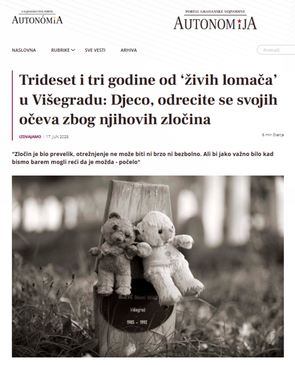Na portalu Autonomija, opskurnom glasilu koje uređuje Gruhonjić, objavljen je sraman tekst sa još sramnijim naslovom: "Trideset i tri godine od 'živih lomača' u Višegradu: Djeco, odrecite se svojih očeva zbog njihovih zločina".