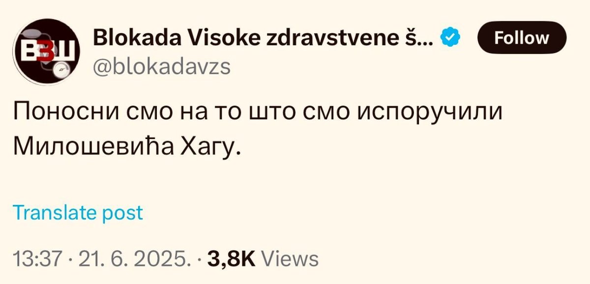 Blokadari Visoke zdravstvene škole poručili su da su ponosni što su na Vidovdan izručili bivšeg predsednika Srbije Slobodana Miloševića haškom tribunalu.