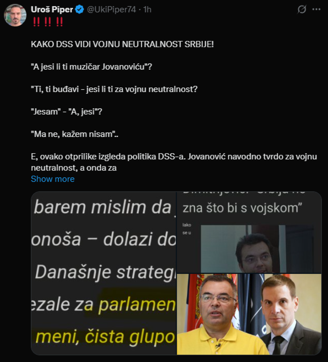 - E, ovako otprilike izgleda politika DSS-a. Jovanović navodno tvrdo za vojnu neutralnost, a onda za savetnika postavi Tadićevca Bojana Dimitrijevića!