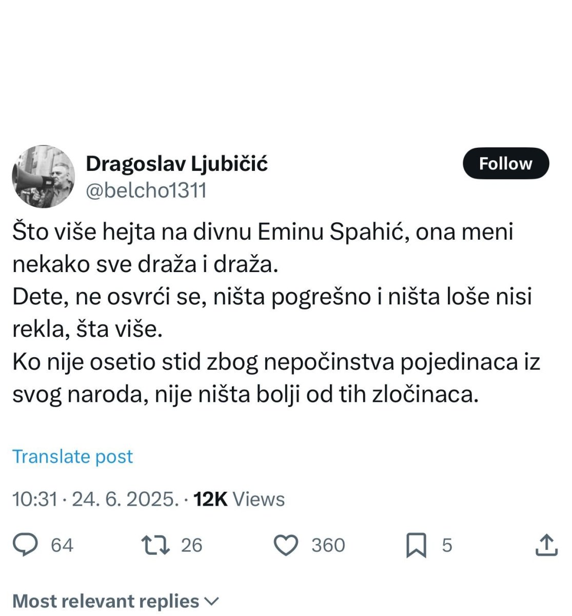 "Što više hejta na divnu Eminu Spahić, ona meni nekako sve draža i draža. Dete, ne osvrći se, ništa pogrešno i ništa loše nisu rekla, štaviše. Ko nije osetio stid zbog nepočinstva pojedinaca iz svog naroda, nije ništa bolji od tih zločinaca", napisao je na društvenim mrežama Dragoslav Ljubičić.