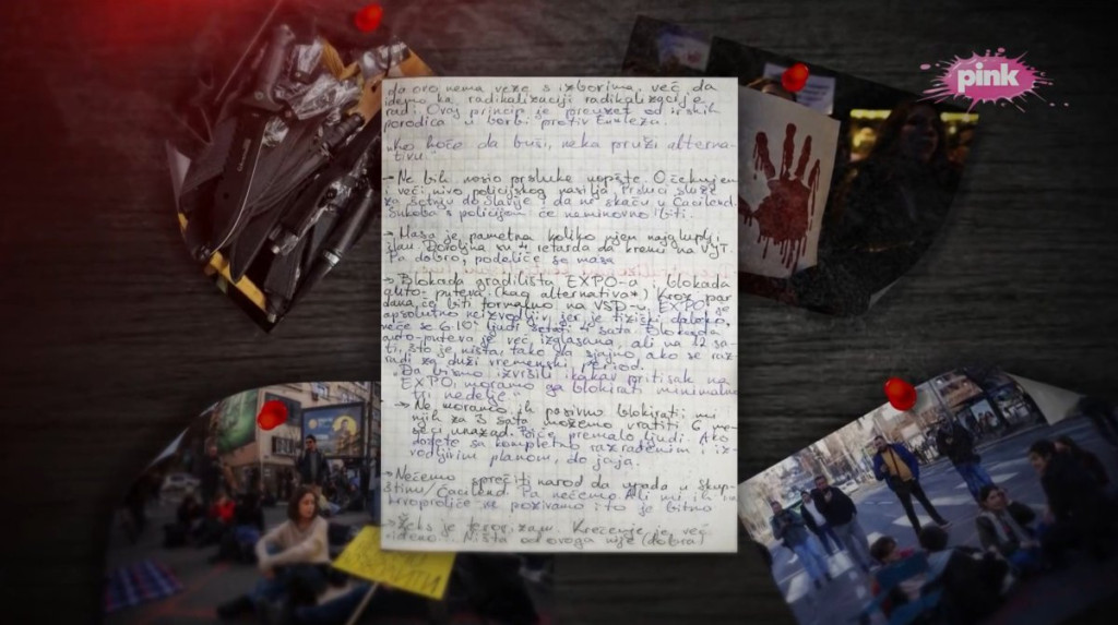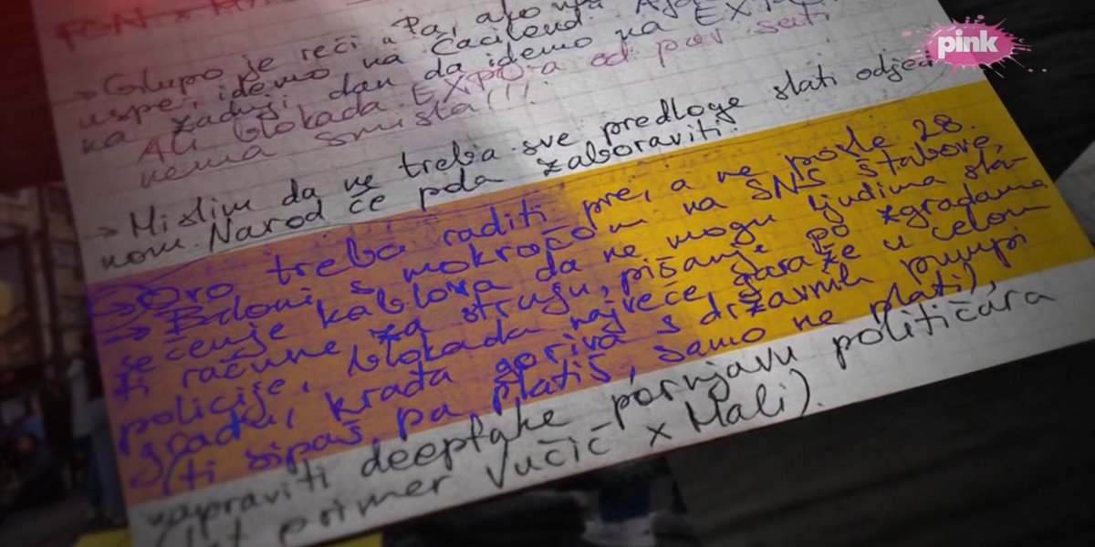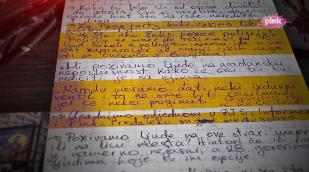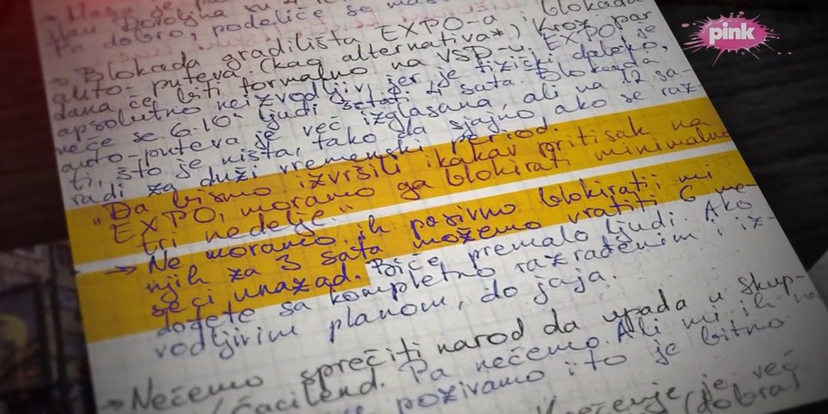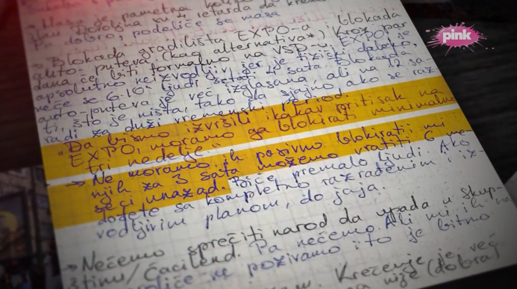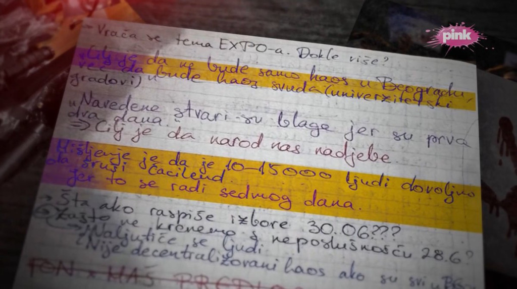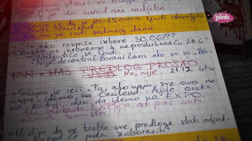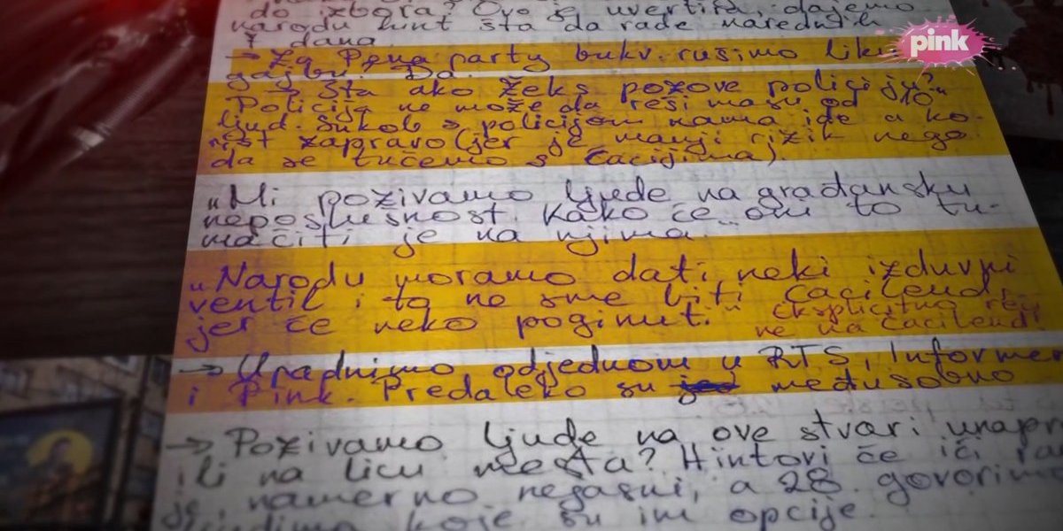 Naime, iz konteksta navedenog teksta napisanog rukom može se zaključiti da je reč o planovima studenata u blokadi tokom protesta koji je najavljen na Vidovdan u Beogradu. Takođe, navedena je mogućnost da nakon 28. juna blokaderi organizuju "Pena parti kod Žeksa" (reč je o vlasniku TV "Pink" Željku Mitroviću), krečenje i deratizaciju stranačkih lokala (najverovatnije se misli na prostorije SNS-a), "oslobađanje" zgrade RTS-a, realizacija akcije "Pink Panter", kao za Republičku izbornu komisiju, ali usmerenu prema medijskoj kući Pink.
