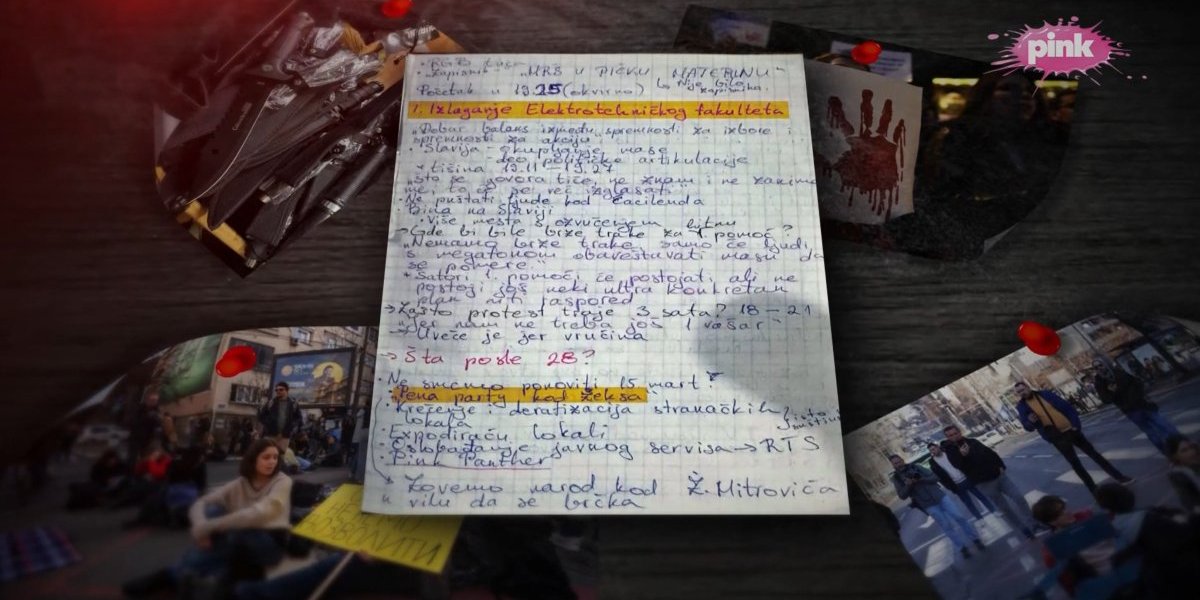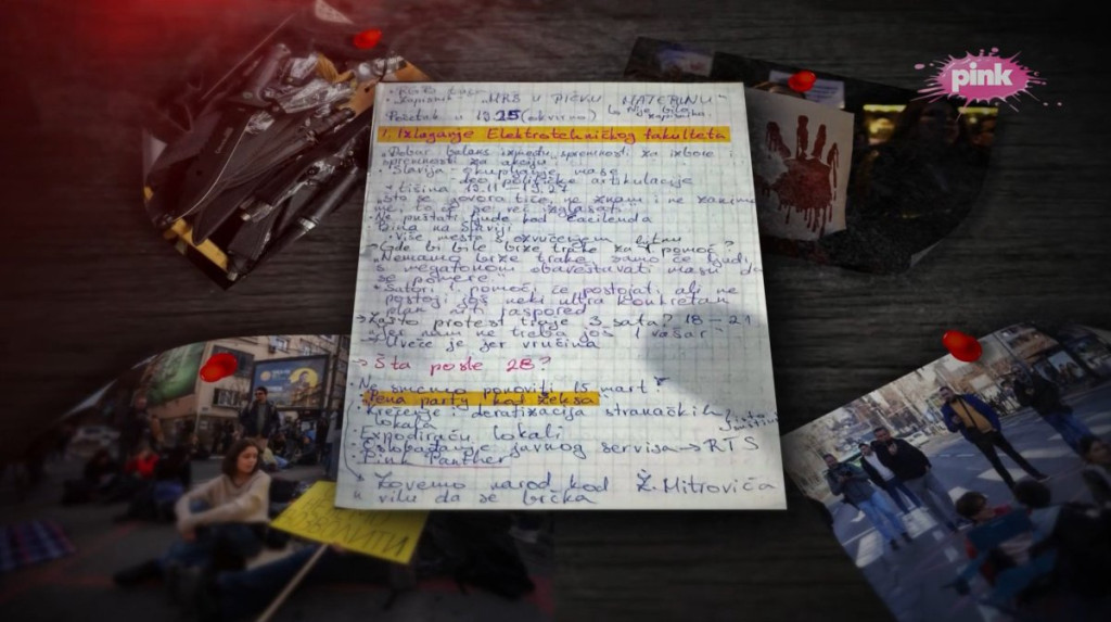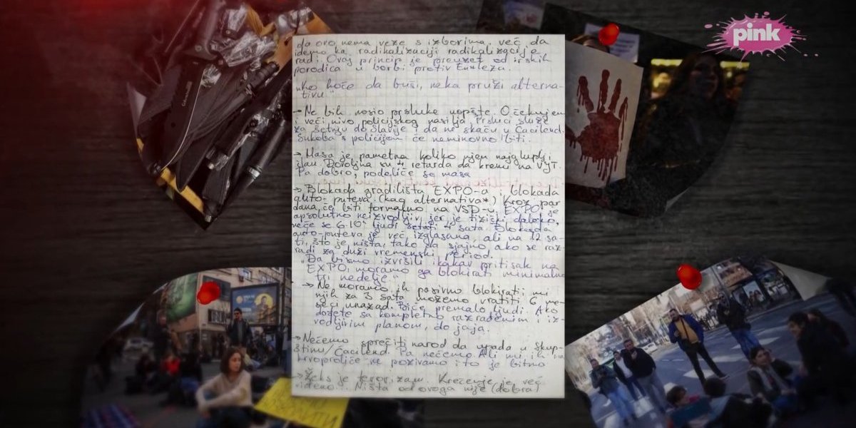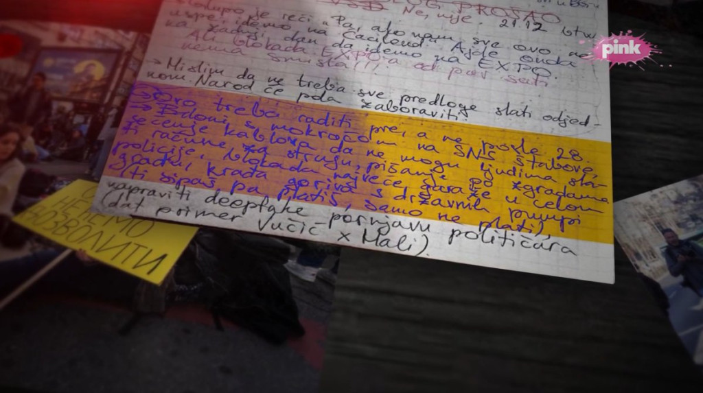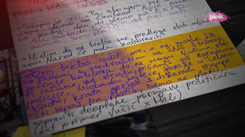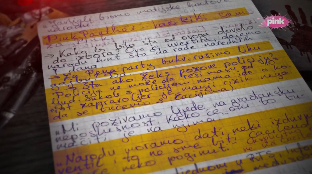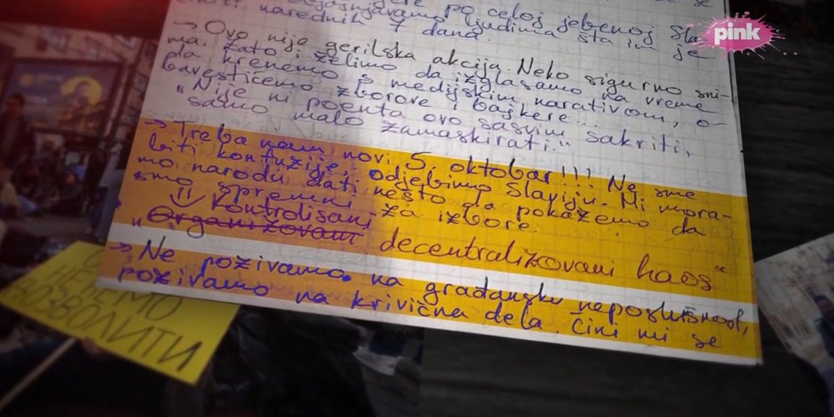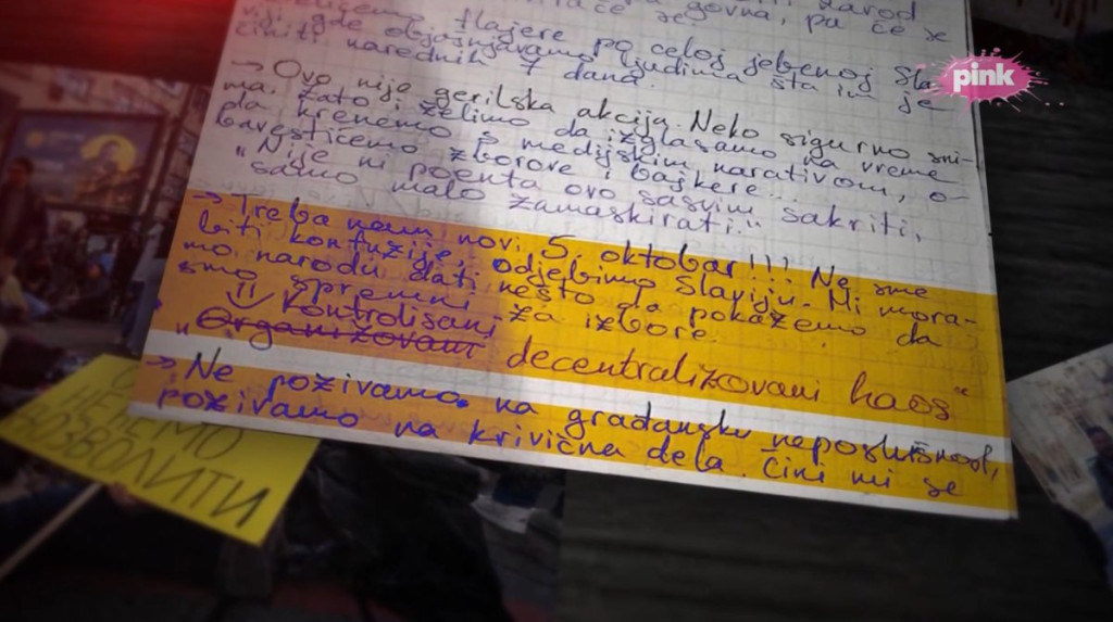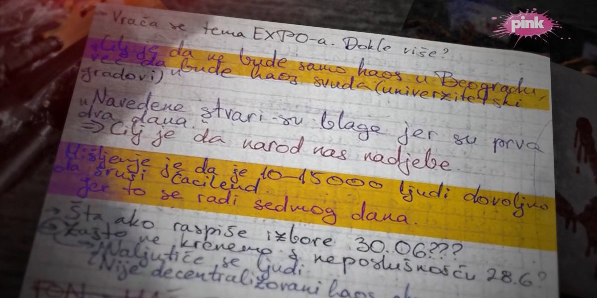 Naime, iz konteksta navedenog teksta napisanog rukom može se zaključiti da je reč o planovima studenata u blokadi tokom protesta koji je najavljen na Vidovdan u Beogradu. Takođe, navedena je mogućnost da nakon 28. juna blokaderi organizuju "Pena parti kod Žeksa" (reč je o vlasniku TV "Pink" Željku Mitroviću), krečenje i deratizaciju stranačkih lokala (najverovatnije se misli na prostorije SNS-a), "oslobađanje" zgrade RTS-a, realizacija akcije "Pink Panter", kao za Republičku izbornu komisiju, ali usmerenu prema medijskoj kući Pink.
