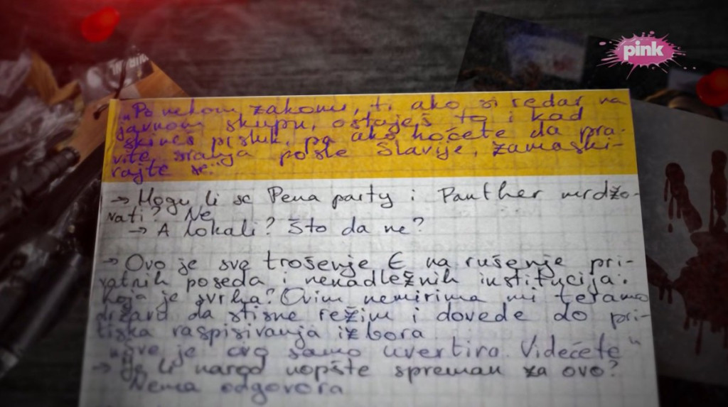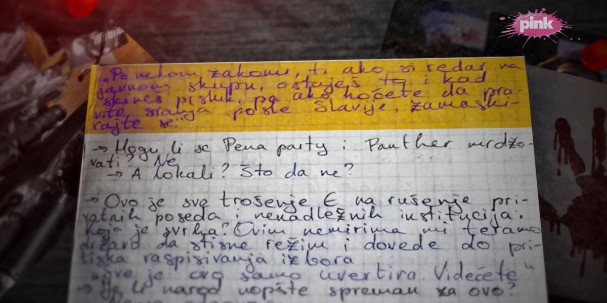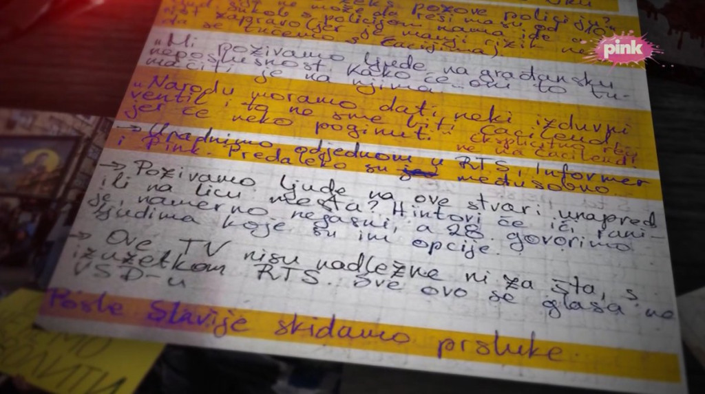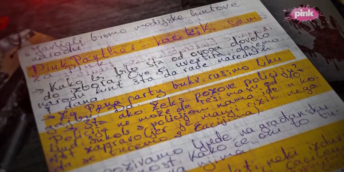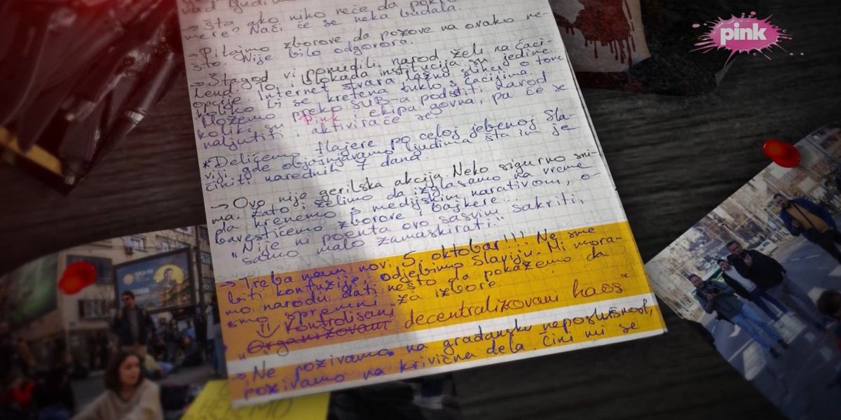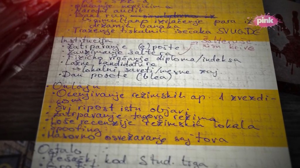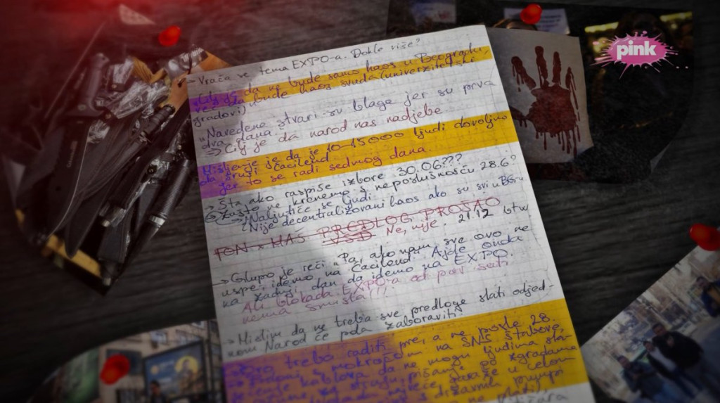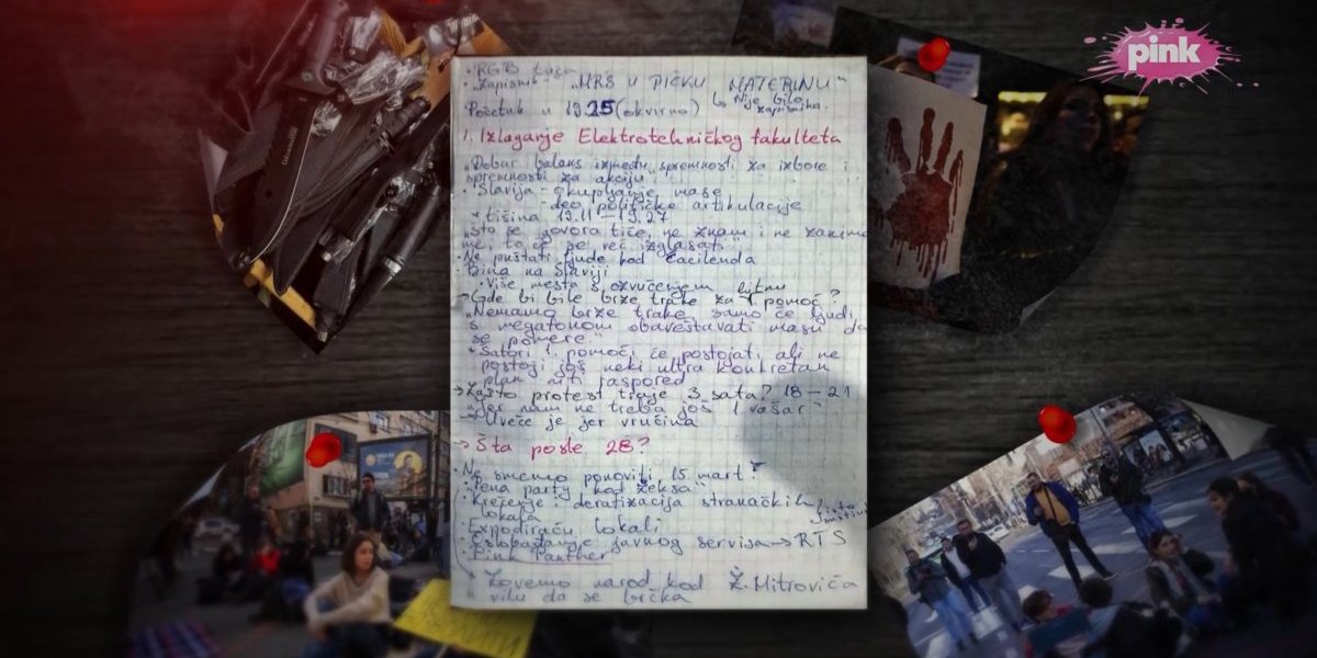 Naime, iz konteksta navedenog teksta napisanog rukom može se zaključiti da je reč o planovima studenata u blokadi tokom protesta koji je najavljen na Vidovdan u Beogradu. Takođe, navedena je mogućnost da nakon 28. juna blokaderi organizuju "Pena parti kod Žeksa" (reč je o vlasniku TV "Pink" Željku Mitroviću), krečenje i deratizaciju stranačkih lokala (najverovatnije se misli na prostorije SNS-a), "oslobađanje" zgrade RTS-a, realizacija akcije "Pink Panter", kao za Republičku izbornu komisiju, ali usmerenu prema medijskoj kući Pink.