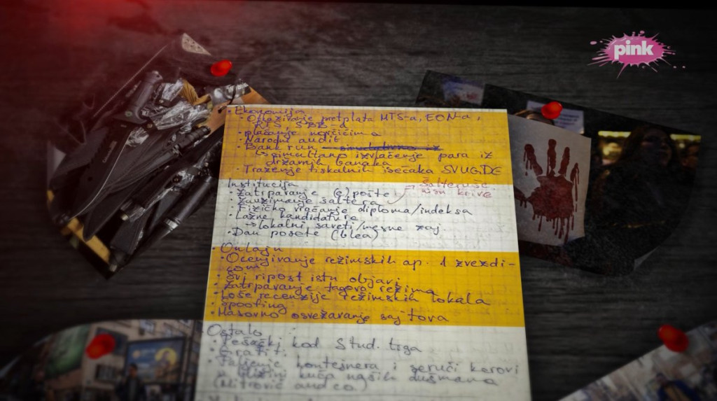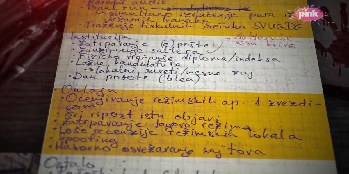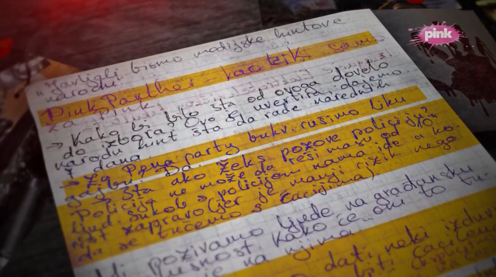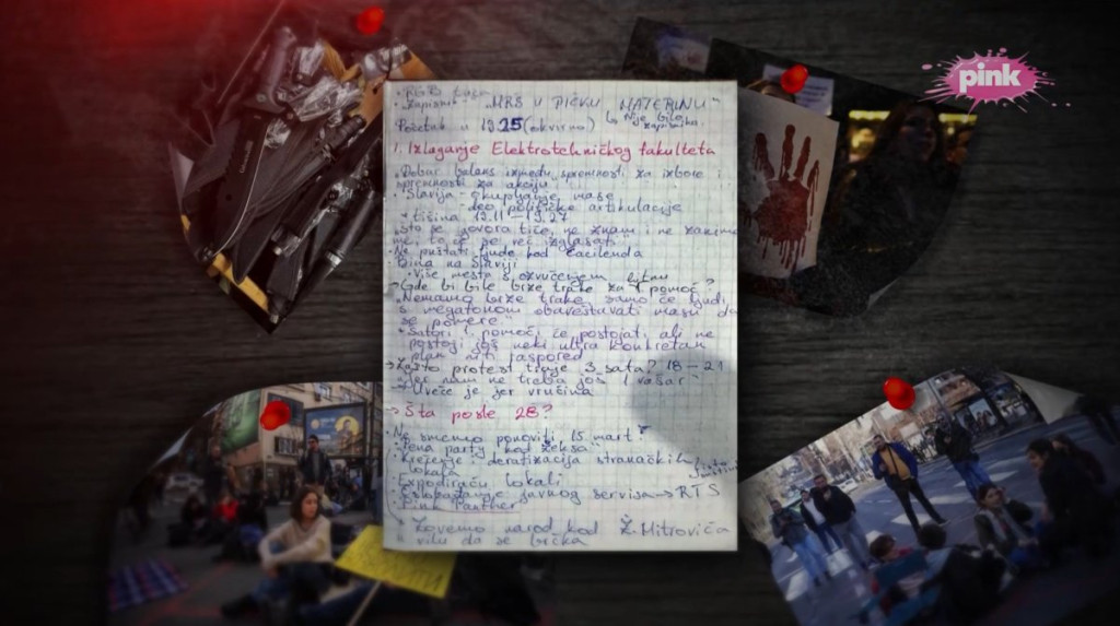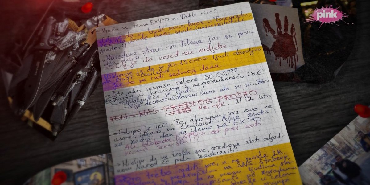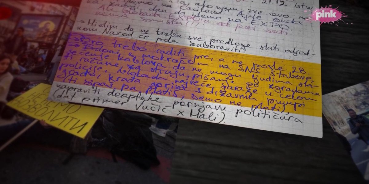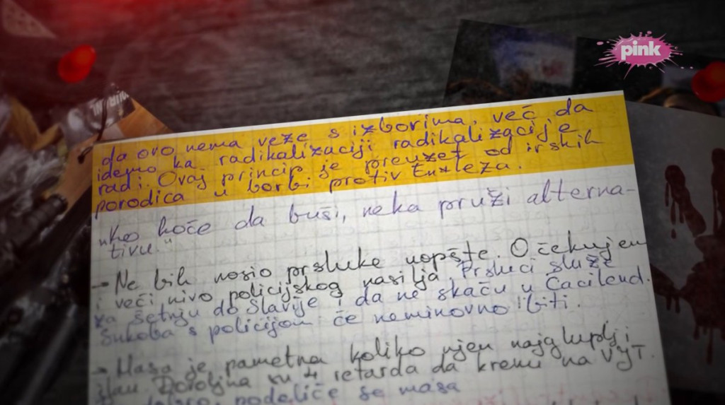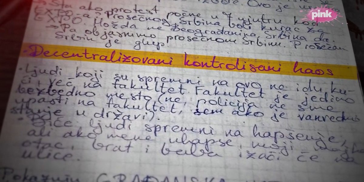 Naime, iz konteksta navedenog teksta napisanog rukom može se zaključiti da je reč o planovima studenata u blokadi tokom protesta koji je najavljen na Vidovdan u Beogradu. Takođe, navedena je mogućnost da nakon 28. juna blokaderi organizuju "Pena parti kod Žeksa" (reč je o vlasniku TV "Pink" Željku Mitroviću), krečenje i deratizaciju stranačkih lokala (najverovatnije se misli na prostorije SNS-a), "oslobađanje" zgrade RTS-a, realizacija akcije "Pink Panter", kao za Republičku izbornu komisiju, ali usmerenu prema medijskoj kući Pink.