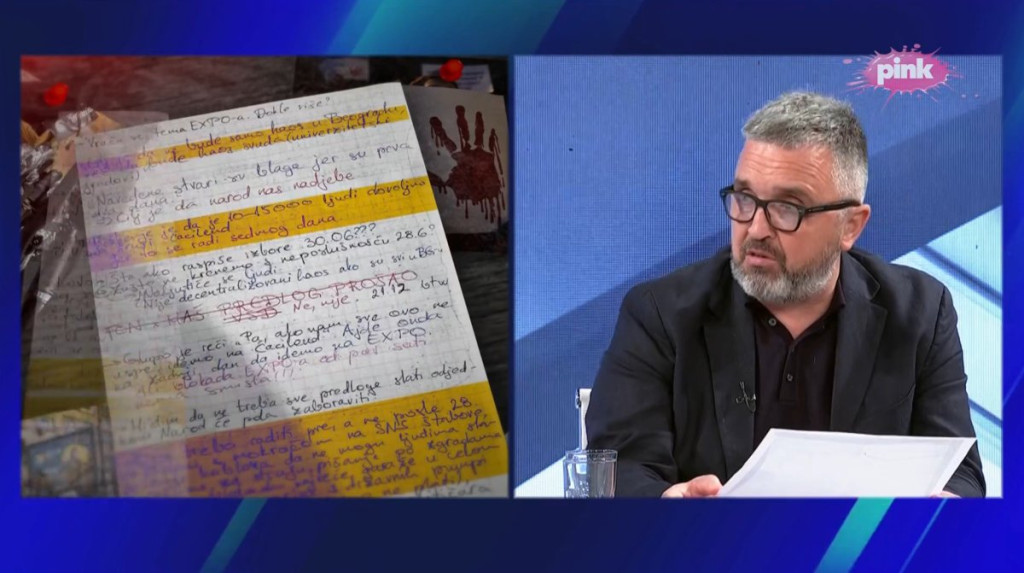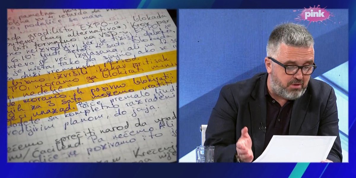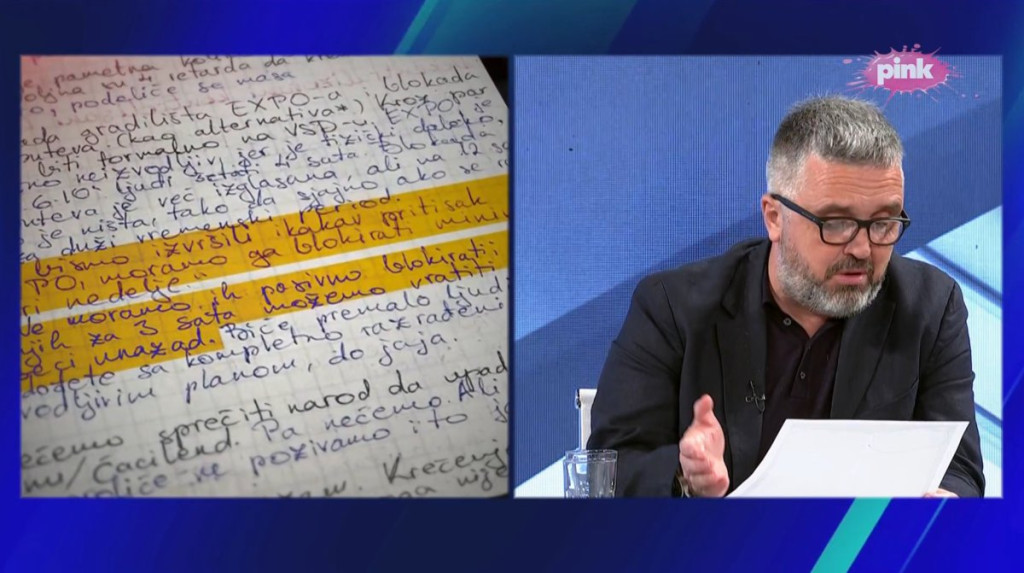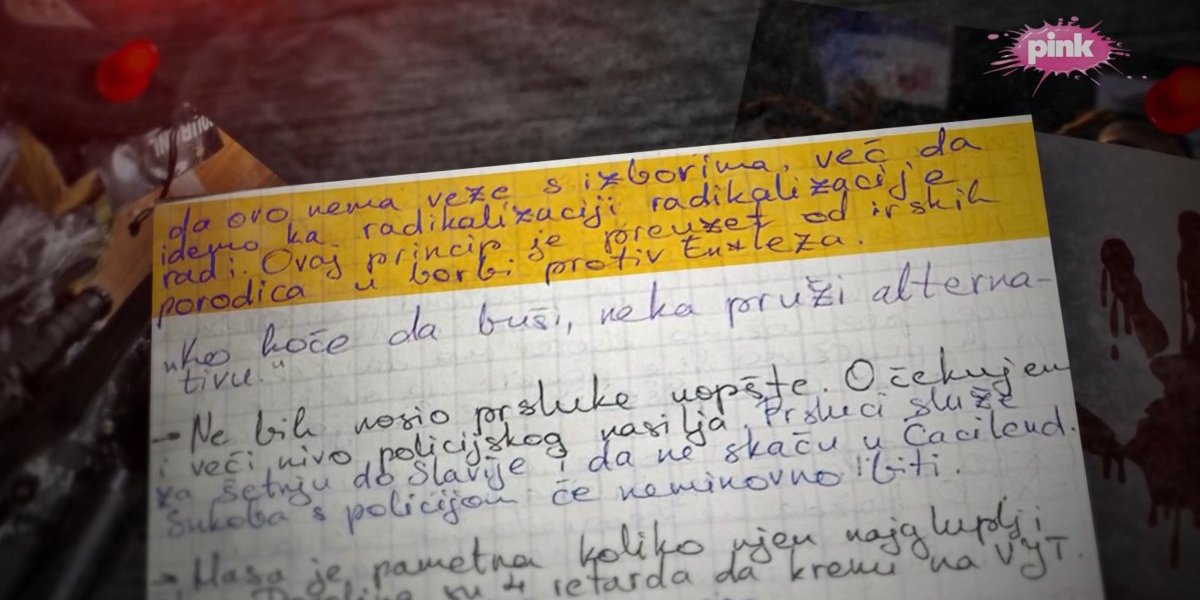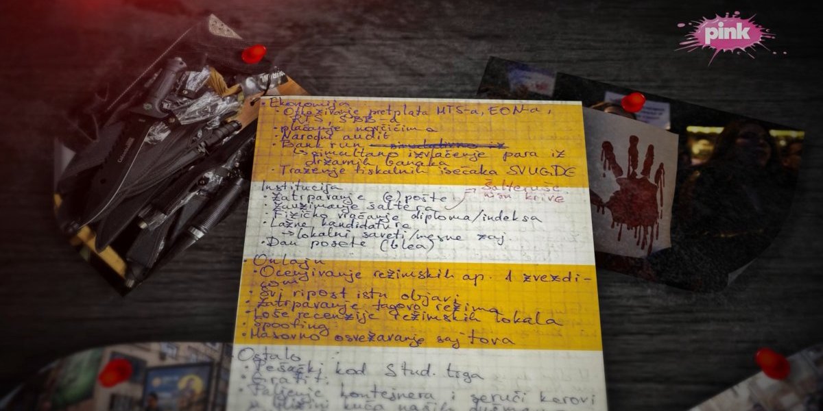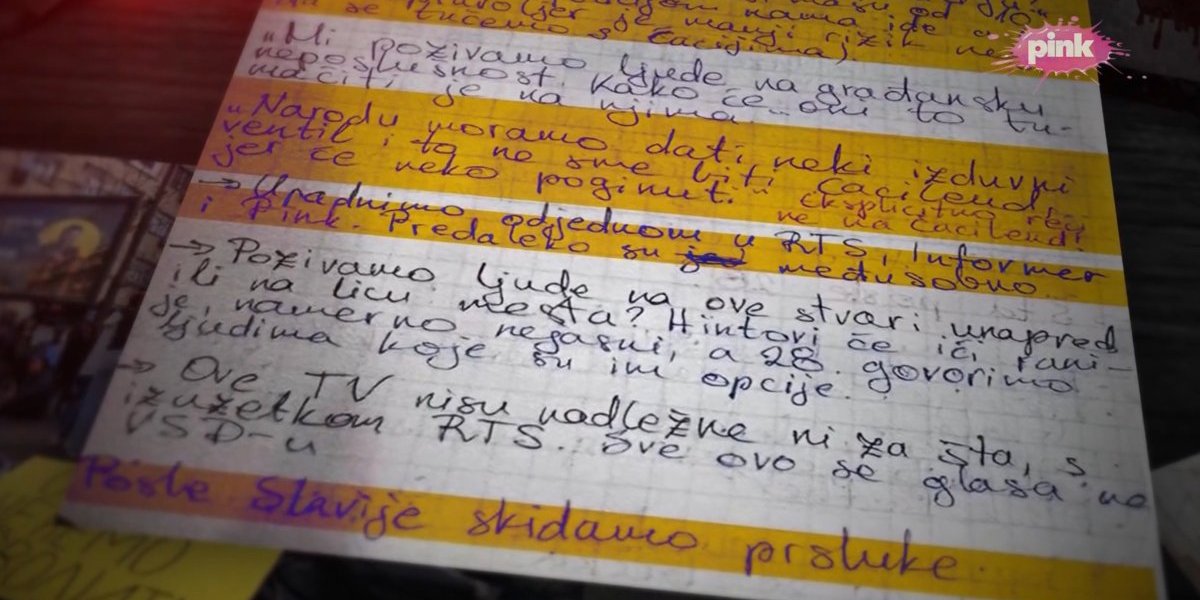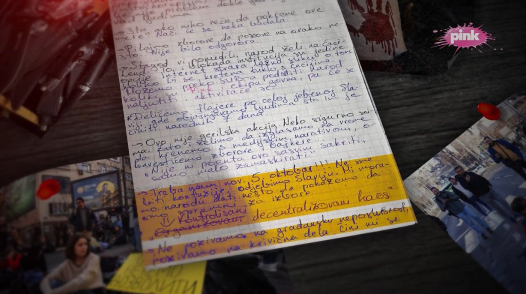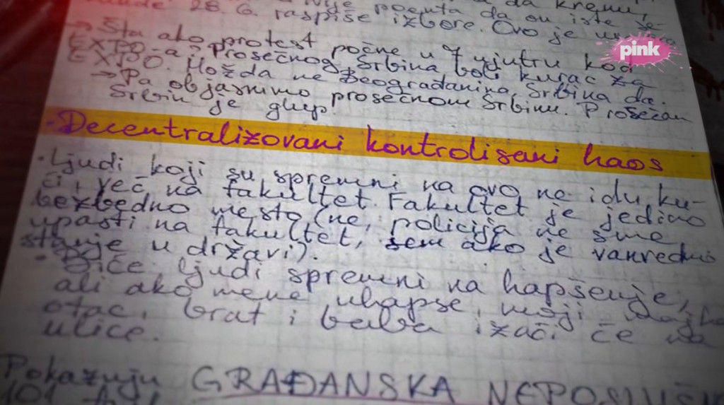 Naime, iz konteksta navedenog teksta napisanog rukom može se zaključiti da je reč o planovima studenata u blokadi tokom protesta koji je najavljen na Vidovdan u Beogradu. Takođe, navedena je mogućnost da nakon 28. juna blokaderi organizuju "Pena parti kod Žeksa" (reč je o vlasniku TV "Pink" Željku Mitroviću), krečenje i deratizaciju stranačkih lokala (najverovatnije se misli na prostorije SNS-a), "oslobađanje" zgrade RTS-a, realizacija akcije "Pink Panter", kao za Republičku izbornu komisiju, ali usmerenu prema medijskoj kući Pink.