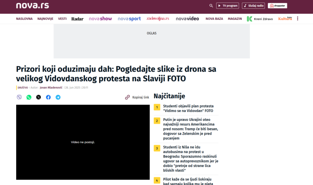 Pod naslovom "Prizori koji oduzimaju dah: Pogledajte slike iz drona sa velikog Vidovdanskog protesta na Slaviji", Nova.rs je objavila vest u skupu blokadera.