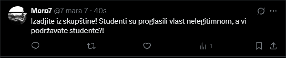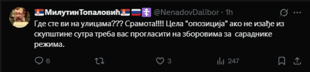 - Veliko razočarenje ste meni od juče... Gde ste Vi i Dragan da stanite ispred naroda koga policija maltretira? Prava opozicija se tako ne ponaša. Narod je sam.
