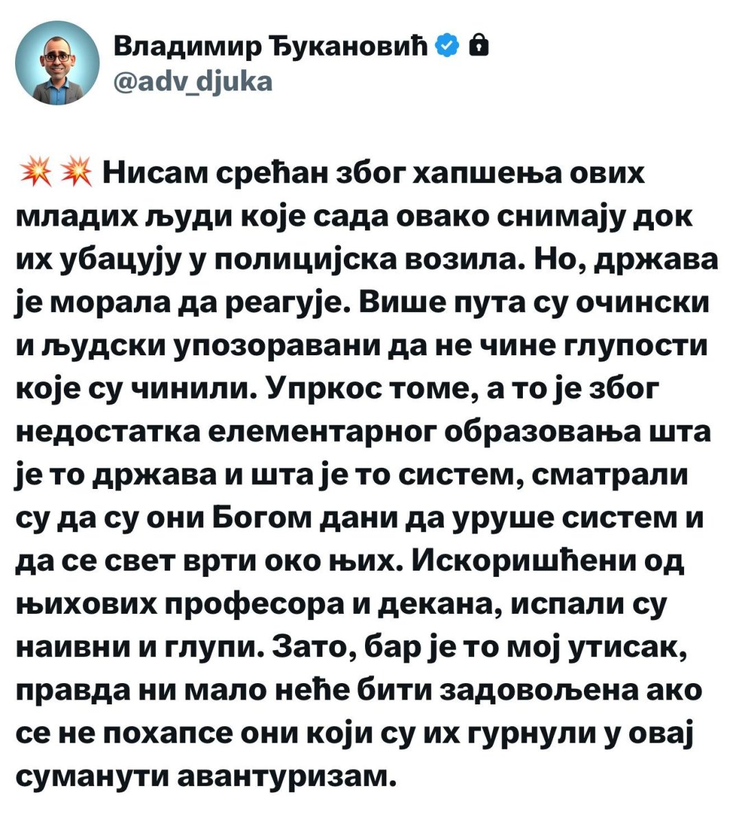 - Više puta su očinski i ljudski upozoravani da ne čine gluposti koje su činili. Uprkos tome, a to je zbog nedostatka elementarnog obrazovanja šta je to država i šta je to sistem, smatrali su da su oni Bogom dani da uruše sistem i da se svet vrti oko njih. Iskorišćeni od njihovih profesora i dekana, ispali su naivni i glupi. Zato, bar je to moj utisak, pravda ni malo neće biti zadovoljena ako se ne pohapse oni koji su ih gurnuli u ovaj sumanuti avanturizam - naveo je Đukanović na Iksu.