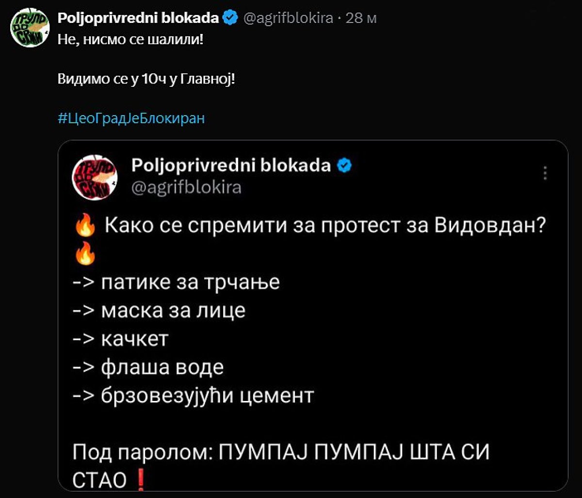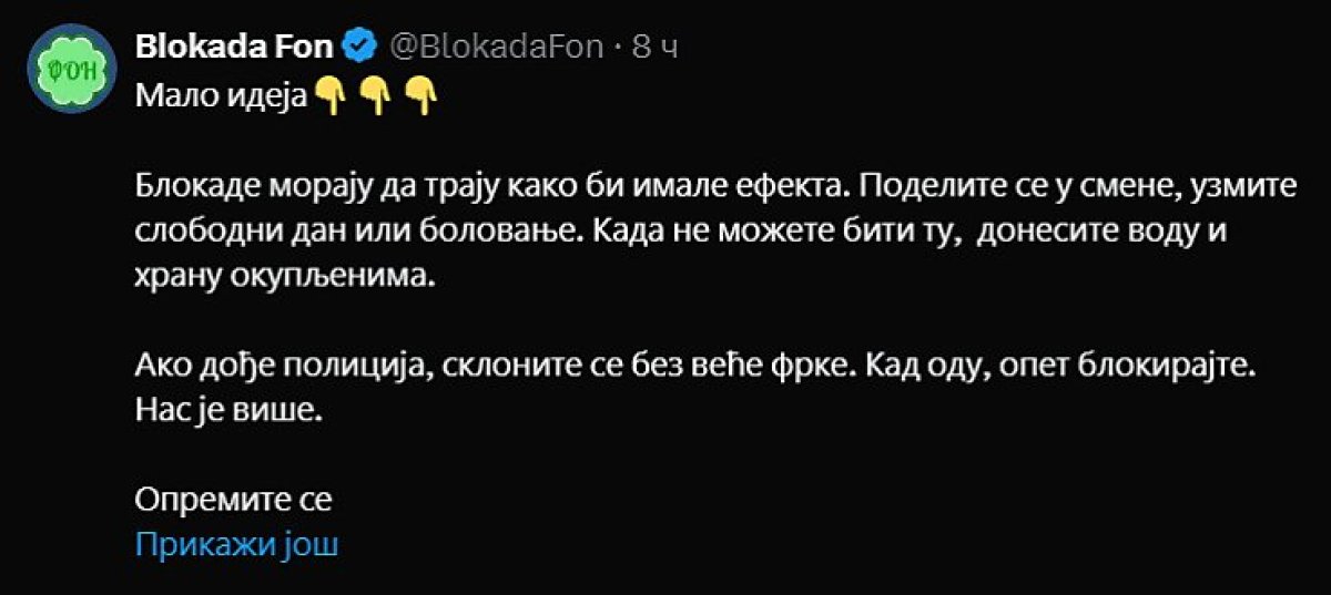 Neki profili čak dele instrukcije za korišćenje materijala koji se mogu koristiti za fizičko onemogućavanje saobraćaja. Jasno je da se radi o dobro razrađenoj mreži digitalnog komandovanja blokadama.