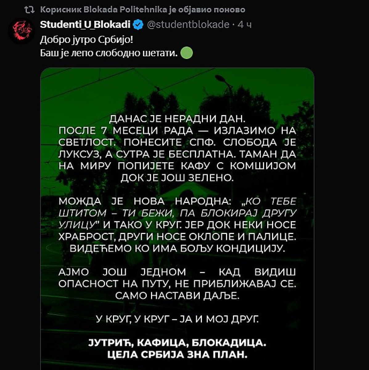 Uprkos činjenici da je Beograd mesecima u blokadi, dok blokaderi, prozapadni mediji i aktivisti u realnom vremenu na mrežama očigledno sinhronizovano izdaju upustva za sabotažu javnog saobraćaja, smenu ljudi, donošenje hrane i vode, i izbegavanje policije, Tužilaštvo za visokotehnološki kriminal uporno ćuti. Na čelu tog tužilaštva je tužilac Boris Majlat, čovek koji nije preduzeo apsolutno ništa u pogledu organizacije koja prelazi u domen terorističkog delovanja protiv ustavnog poretka.
