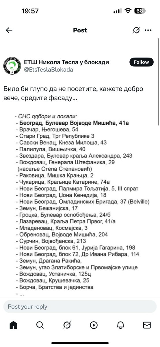 Oni su na "Iksu" objavili spisak svih adresa prostorija SNS u Beogradu uz jasnu pretnju: