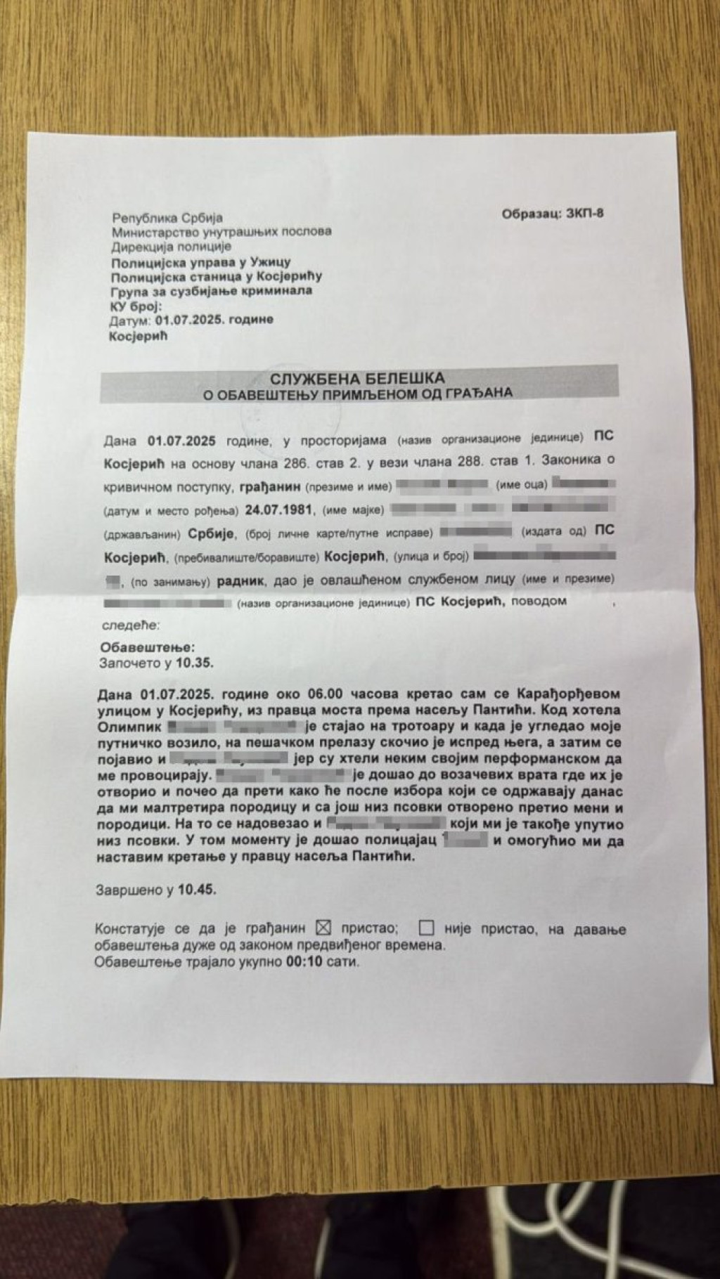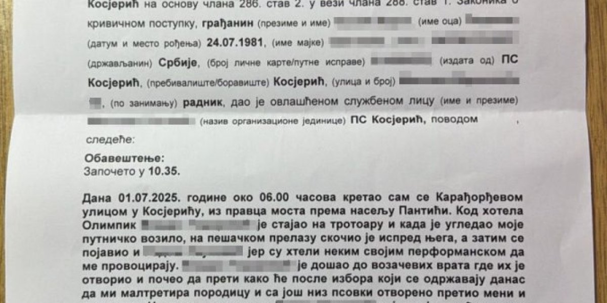Predsednik opštine Kosjerić Žarko Đokić prijavio je nasilje blokadera u Kosjeriću.