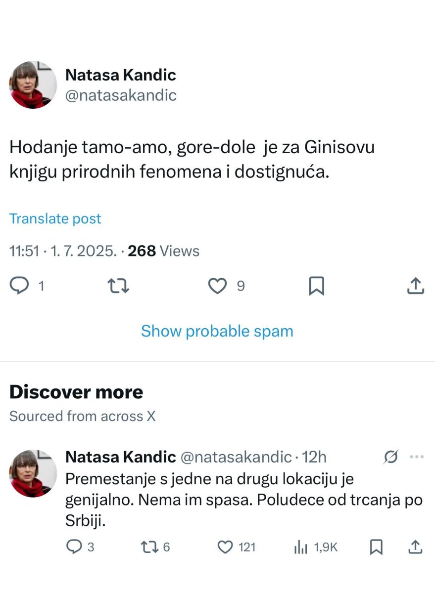 "Hodanje tamo-amo, gore-dole je za Ginisovu knjigu prirodnih fenomena i dostignuća", napisala je Kandićeva na društvenoj mreži Iks.