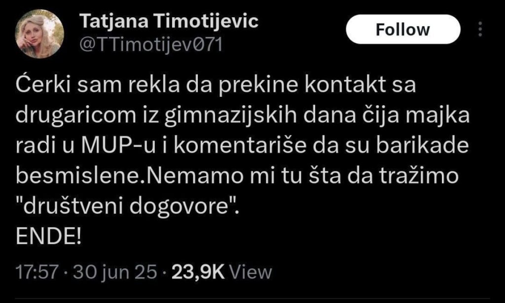 - Ćerki sam rekla da prekine kontakt sa drugaricom iz gimnazijskih dana čija majka radi u MUP i komentariše da su blokade besmislene. Nemamo mi tu šta da tražimo društvene dogovore. Ende - napisala je ona.
