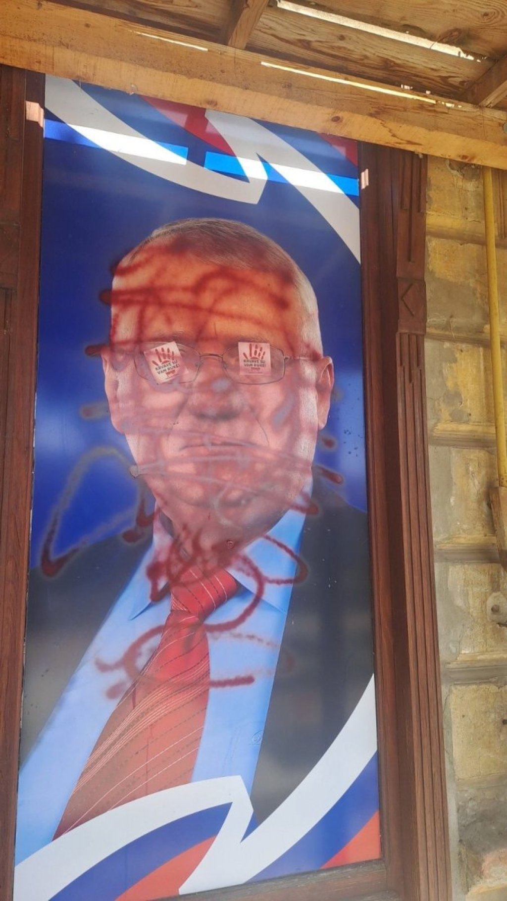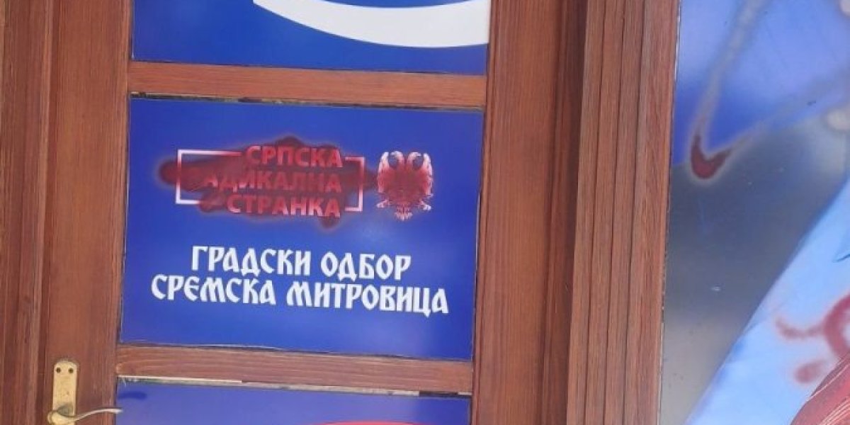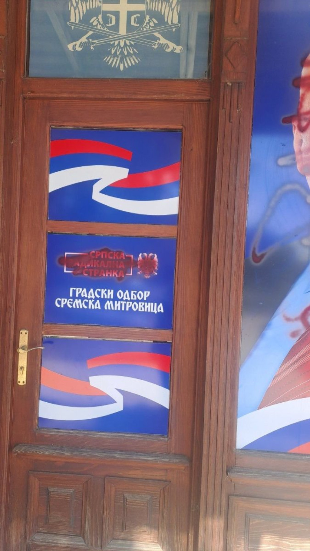 Nepoznati huligani oskrnavili su izlog, išarajući lik vođe radikala, Vojislava Šešelja, farbom, dok su preko zalepili nalepnice sa slikom crvene ruke koja simbolizuje krv!