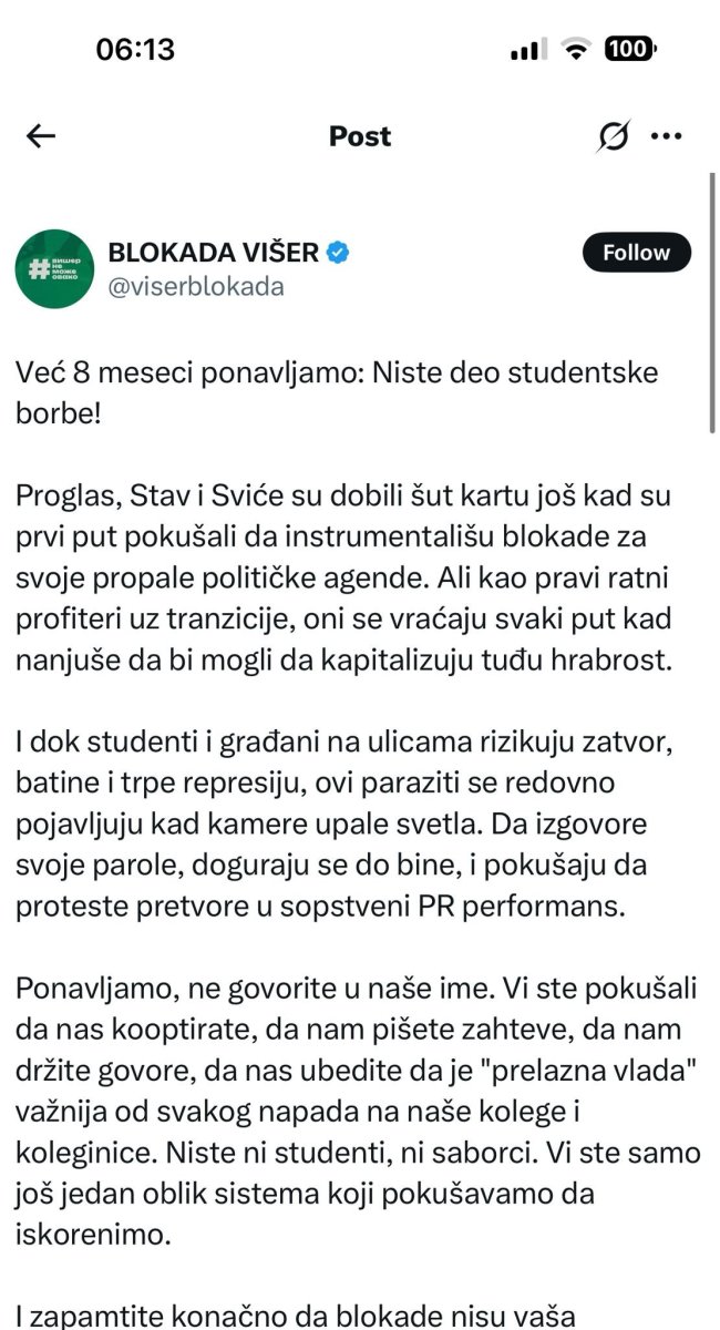 Dok glume jedinstvo pred kamerama, iza kulisa vlada rat do istrebljenja! Blokaderi sa Više škole elektrotehnike i računarstva brutalno su se obrušili na vođe "Proglasa", "Stava" i "Sviće", optužujući ih za krađu, manipulaciju i političko profiterstvo!