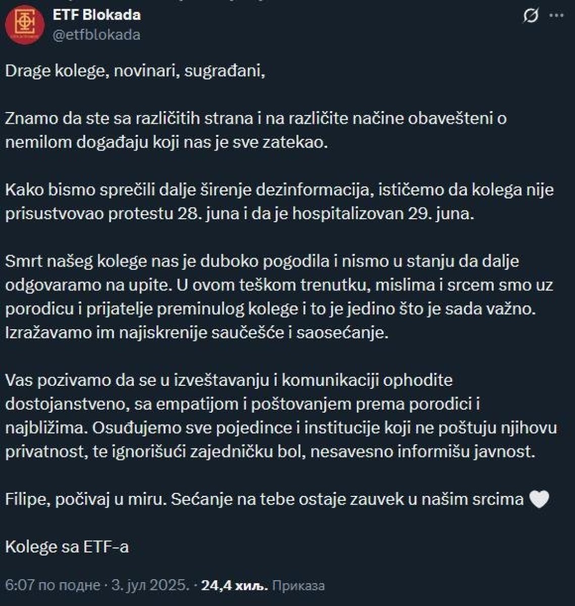 Naime, studenti u blokadi sa ETF-a objavili su saopštenje u kom su naveli da smrt njihovog kolege nema veze sa protestom koji se dogodio 28. juna na Vidovdan, te da on nije ni prisustvovao istom.