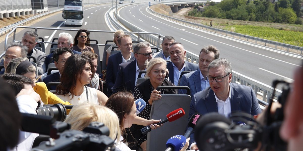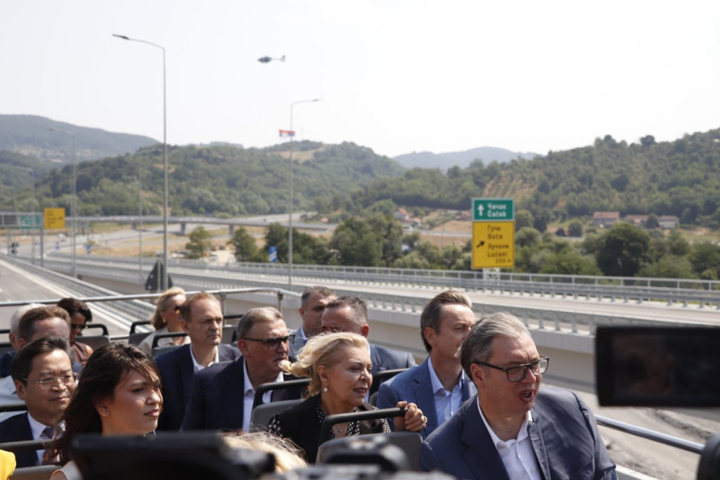 Predsednik Vučić sa grupom zvaničnika i novinara obilazi novu deonicu otvorenim autobusom.