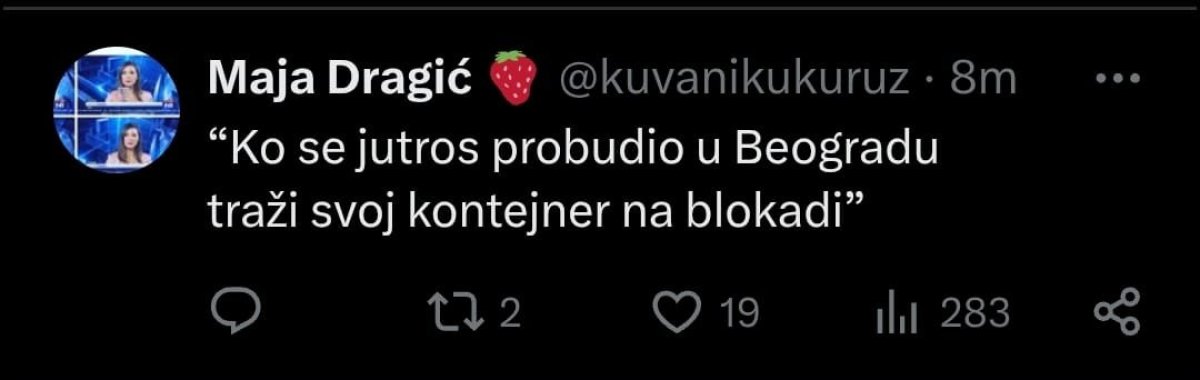 - Ko se jutros probudio u Beogradu, traži svoj kontejner na blokadi - napisala je ona na svom Iks profilu, na kojem je i te kako politički aktivna.