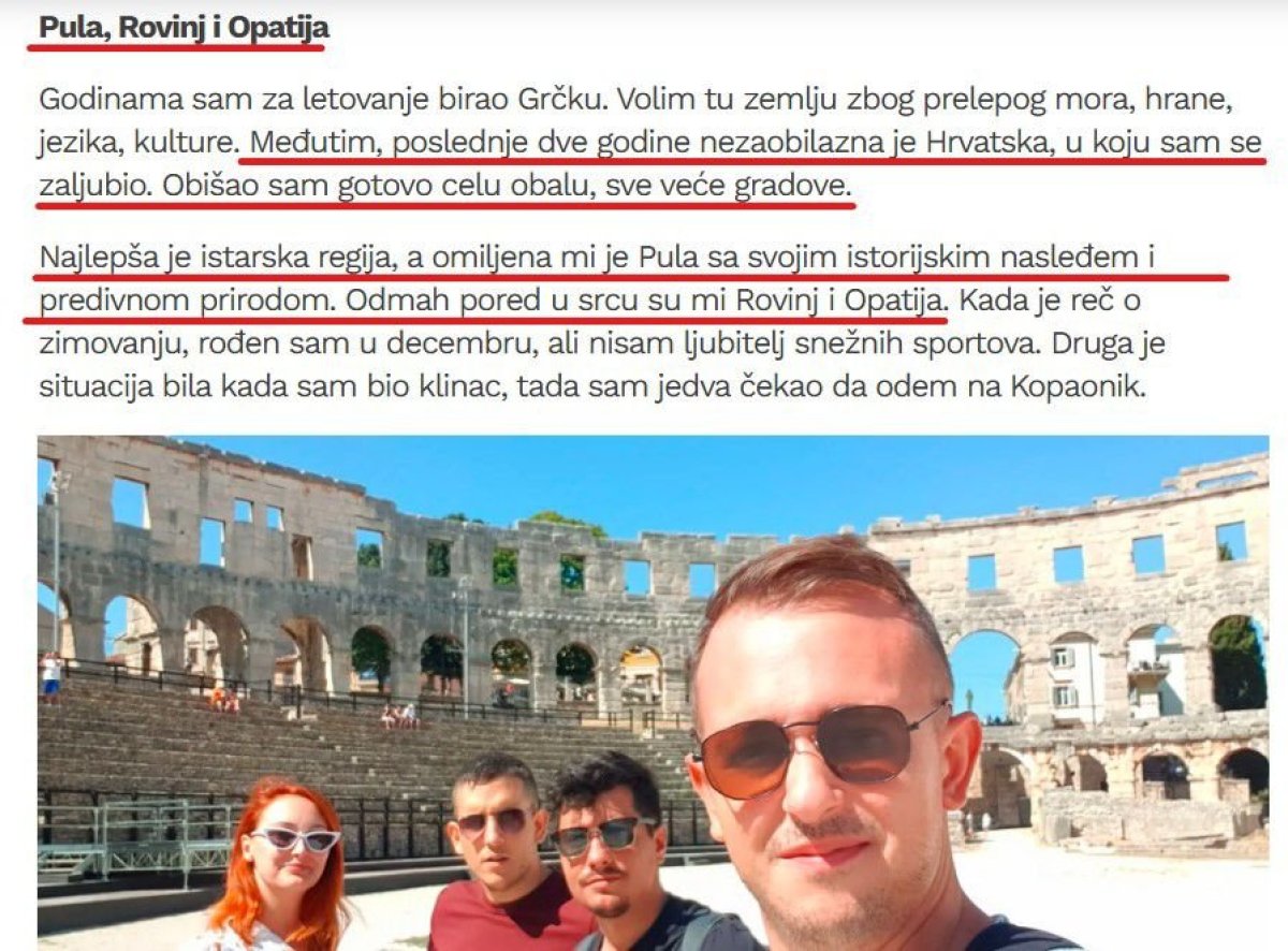 - Najlepša je istarska regija, a omiljena mi je Pula sa svojim istorijskim nasleđem i predivnom prirodom. Odmah pored u srcu su mi Rovinj i Opatija. Kada je reč o zimovanju, rođen sam u decembru, ali nisam ljubitelj snežnih sportova. Druga je situacija bila kada sam bio klinac, tada sam jedva čekao da odem na Kopaonik - dodao je on.