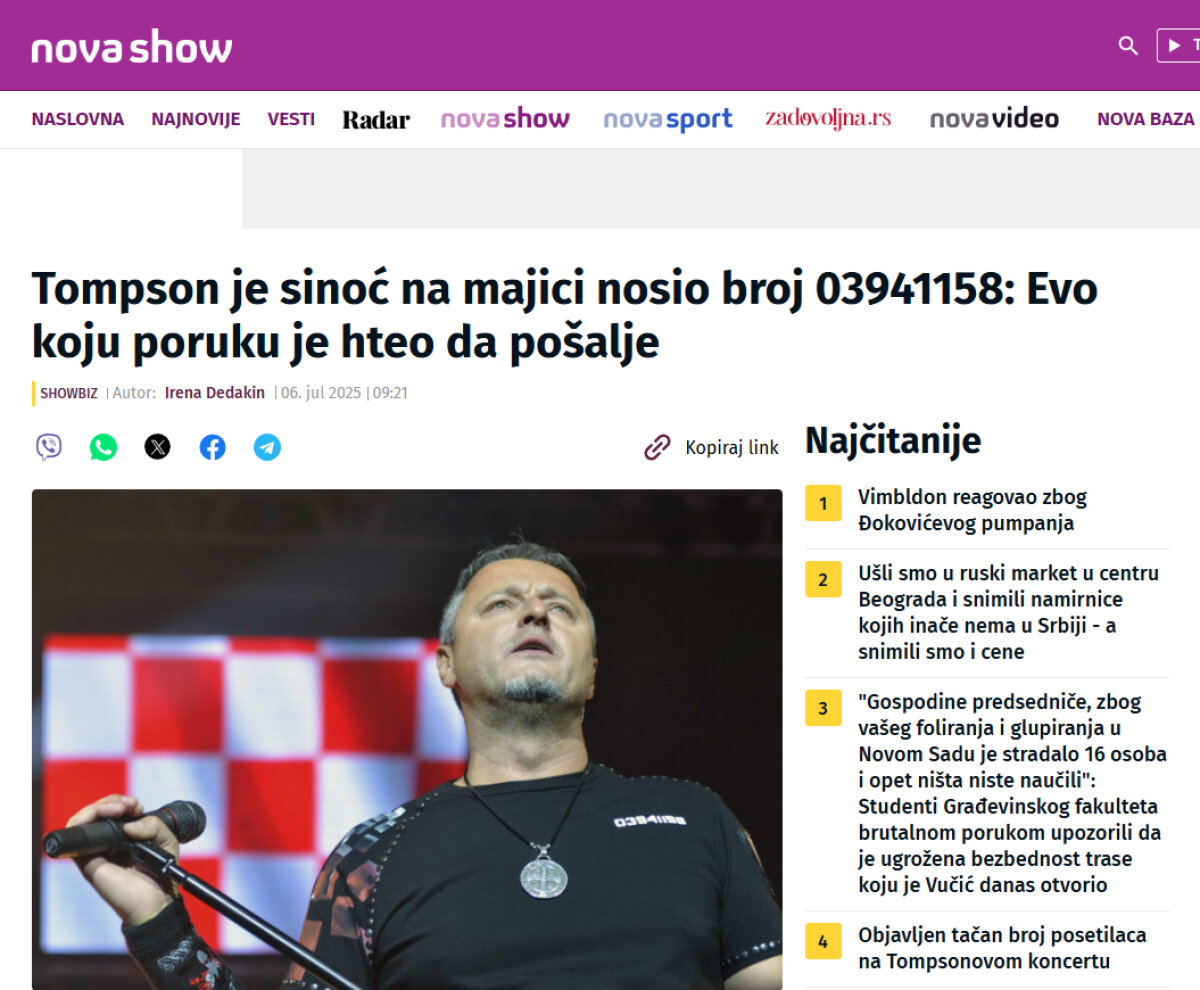 "Tompson je sinoć na majici nosio broj 03941158: Evo koju poruku je hteo da pošalje", glasi naslov članka koji je objavio opozicioni kvazi medij na rubrici "Showbiz", a koji je pun pojašljavanja i razumevanja za ustaške origije na zagrebačkom hipodromu.