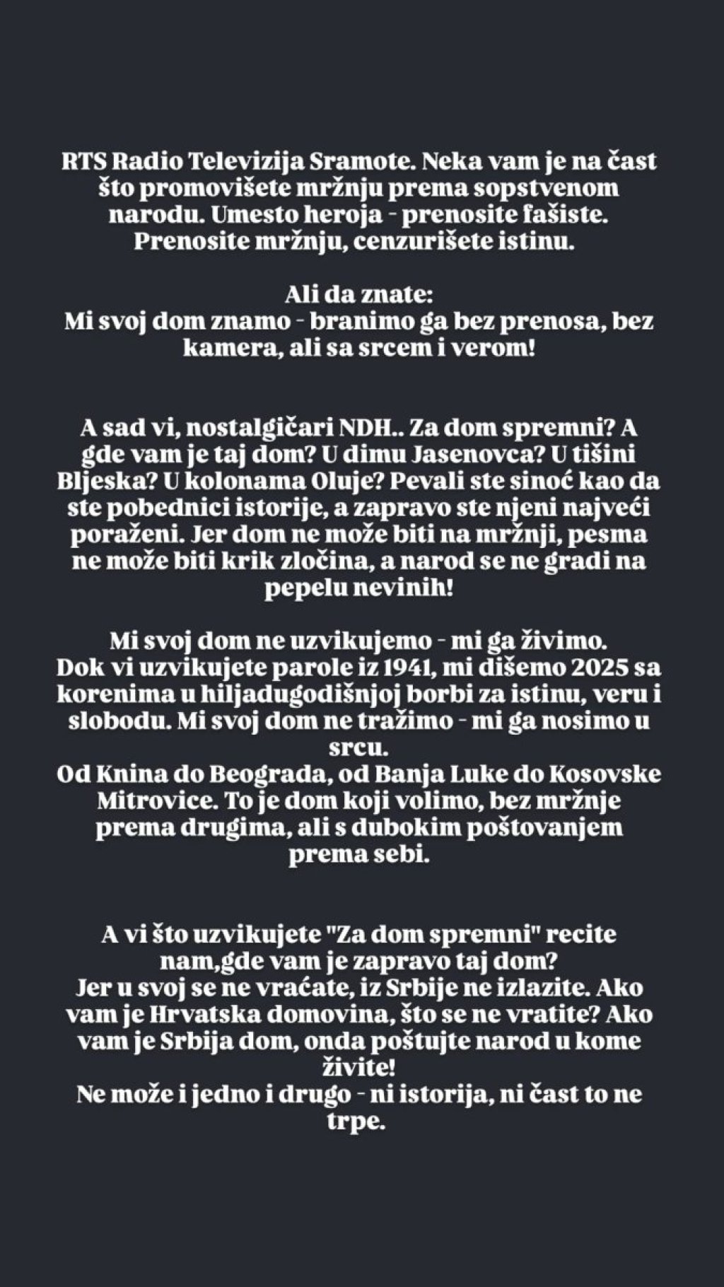 A sad vi, nostalgičari NDH.. Za dom spremni? A gde vam je taj dom? U dimu Jasenovca? U tišini Bljeska? U kolonama Oluje? Pevali ste sinoć kao da ste pobednici istorije, a zapravo ste njeni najveći poraženi. Jer dom ne može biti na mržnji, pesma ne može biti krik zločina, a narod se ne gradi na pepelu nevinih!