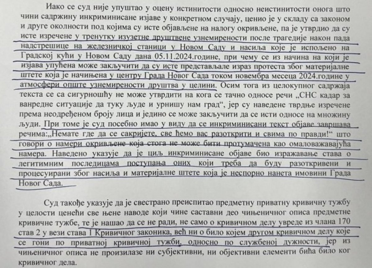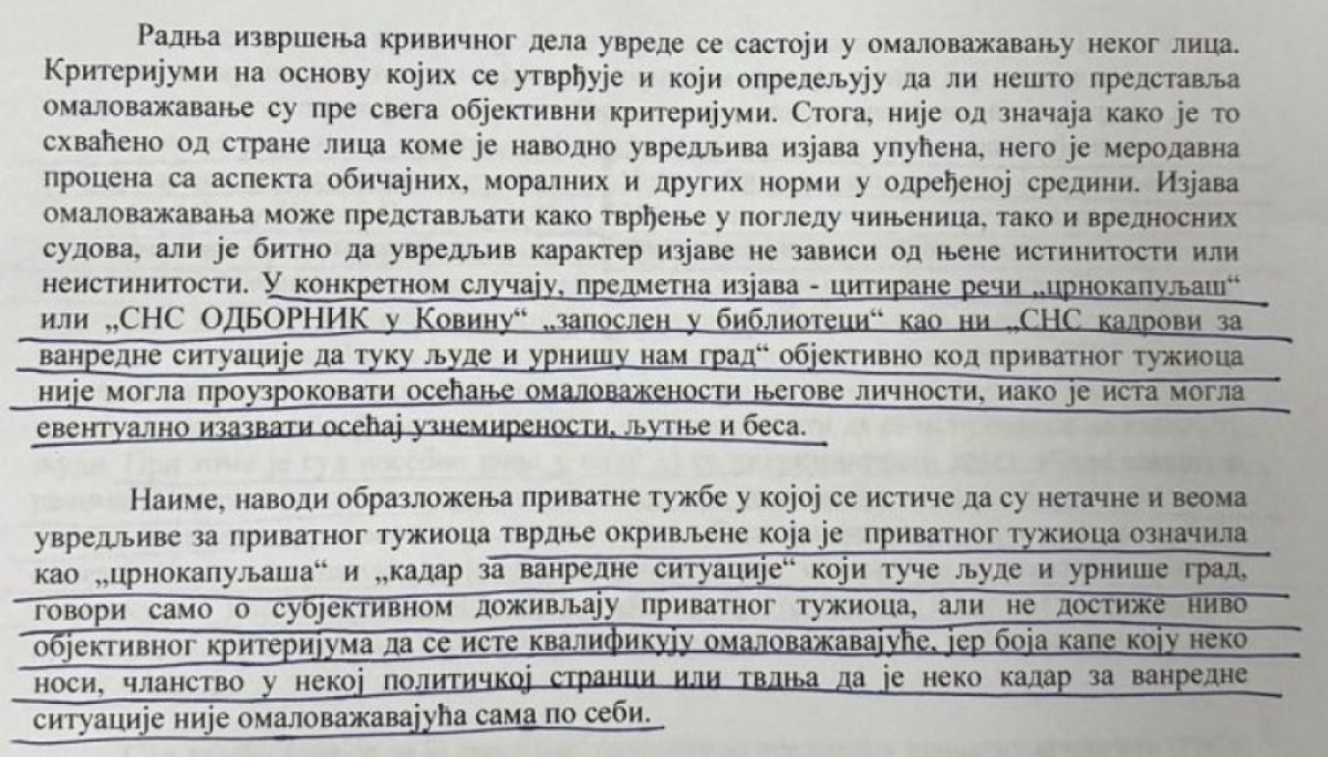 Sudija je, bez saslušanja stranaka u postupku i bez trunke sramote, zaključila da su tvrdnje okrivljene „subjektivni doživljaj privatnog tužioca“, te da „ne dostižu nivo objektivnog kriterijuma da se iste kvalifikuju omalovažavajuće“, jer „boja kape koju neko nosi, članstvo u nekoj političkoj stranci ili tvrdnja da je neko kadar za vanredne situcije nije omalovažavajuća sama po sebi“.