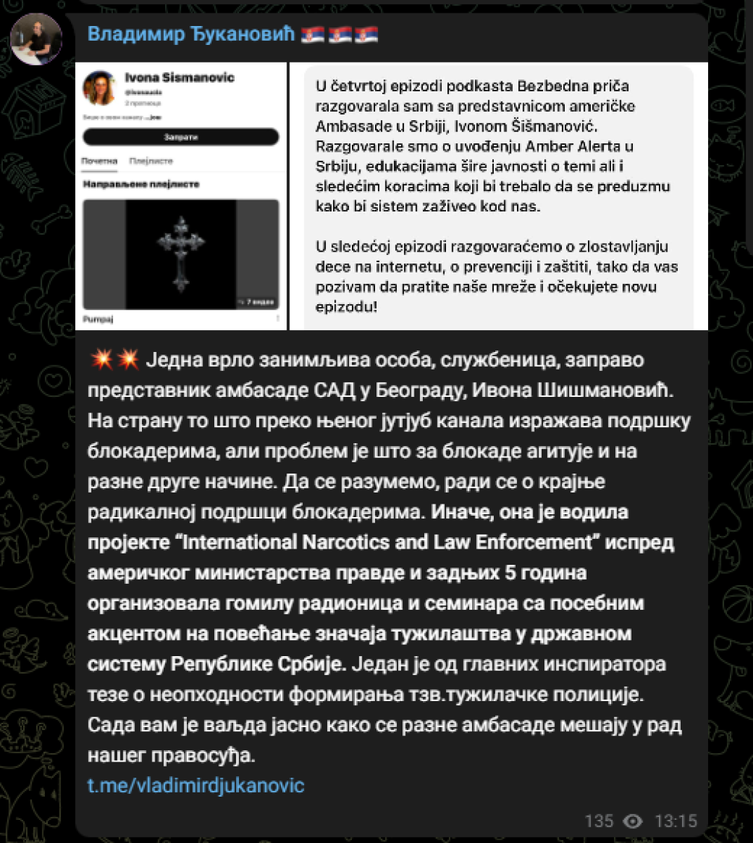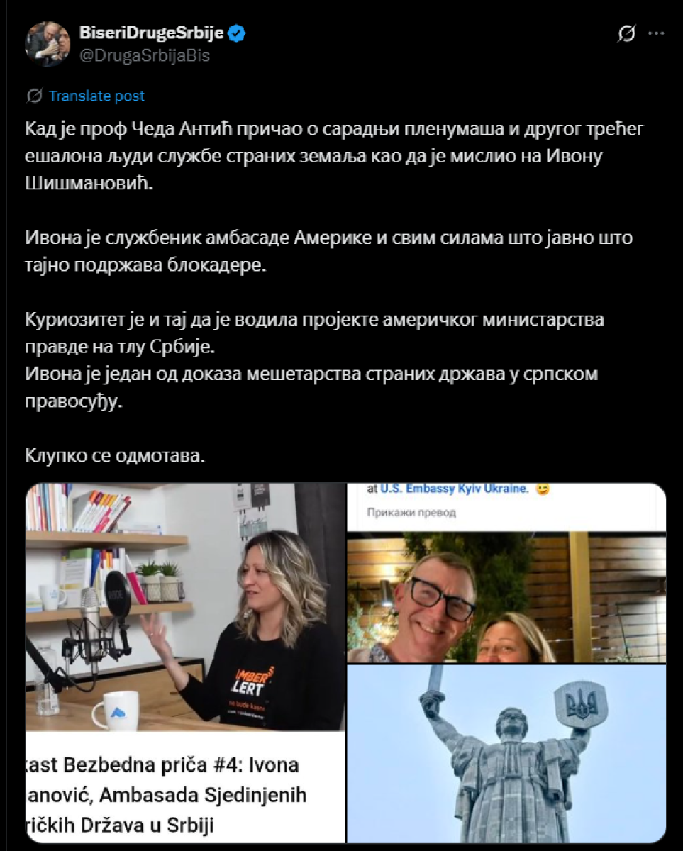 - Jedna vrlo zanimljiva osoba, službenica, zapravo predstavnik ambasade SAD u Beogradu, Ivona Šišmanović. Na stranu to što preko njenog jutjub kanala izražava podršku blokaderima, ali problem je što za blokade agituje i na razne druge načine. Da se razumemo, radi se o krajnje radikalnoj podršci blokaderima. Inače, ona je vodila projekte "International Narcotics and Law Enforcement" ispred američkog ministarstva pravde i zadnjih 5 godina organizovala gomilu radionica i seminara sa posebnim akcentom na povećanje značaja tužilaštva u državnom sistemu Republike Srbije. Jedan je od glavnih inspiratora teze o neophodnosti formiranja tzv.tužilačke policije. Sada vam je valjda jasno kako se razne ambasade mešaju u rad našeg pravosuđa - navodi se u objavi.