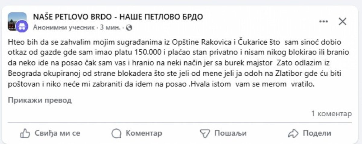 - Hteo bih da se zahvalim mojim sugrađanima iz Opštine Rakovica i Čukarice što sam sinoć dobio otkaz od gazde gde sam imao platu 150.000 i plaćao stan privatno i nisam nikog blokirao ili branio da neko ide na posao čak sam vas i hranio na neki način jer sam burek majstor. Zato odlazim iz Beograda okupiranog od strane blokadera. Što ste jeli od mene, jeli ste. Ja odoh na Zlatibor gde ću biti poštovan i niko mi neće zabraniti da idem na posao. Hvala istom vam se merom vratilo - naveo je on.