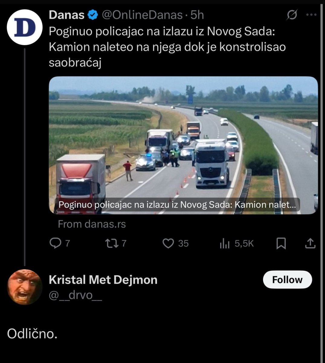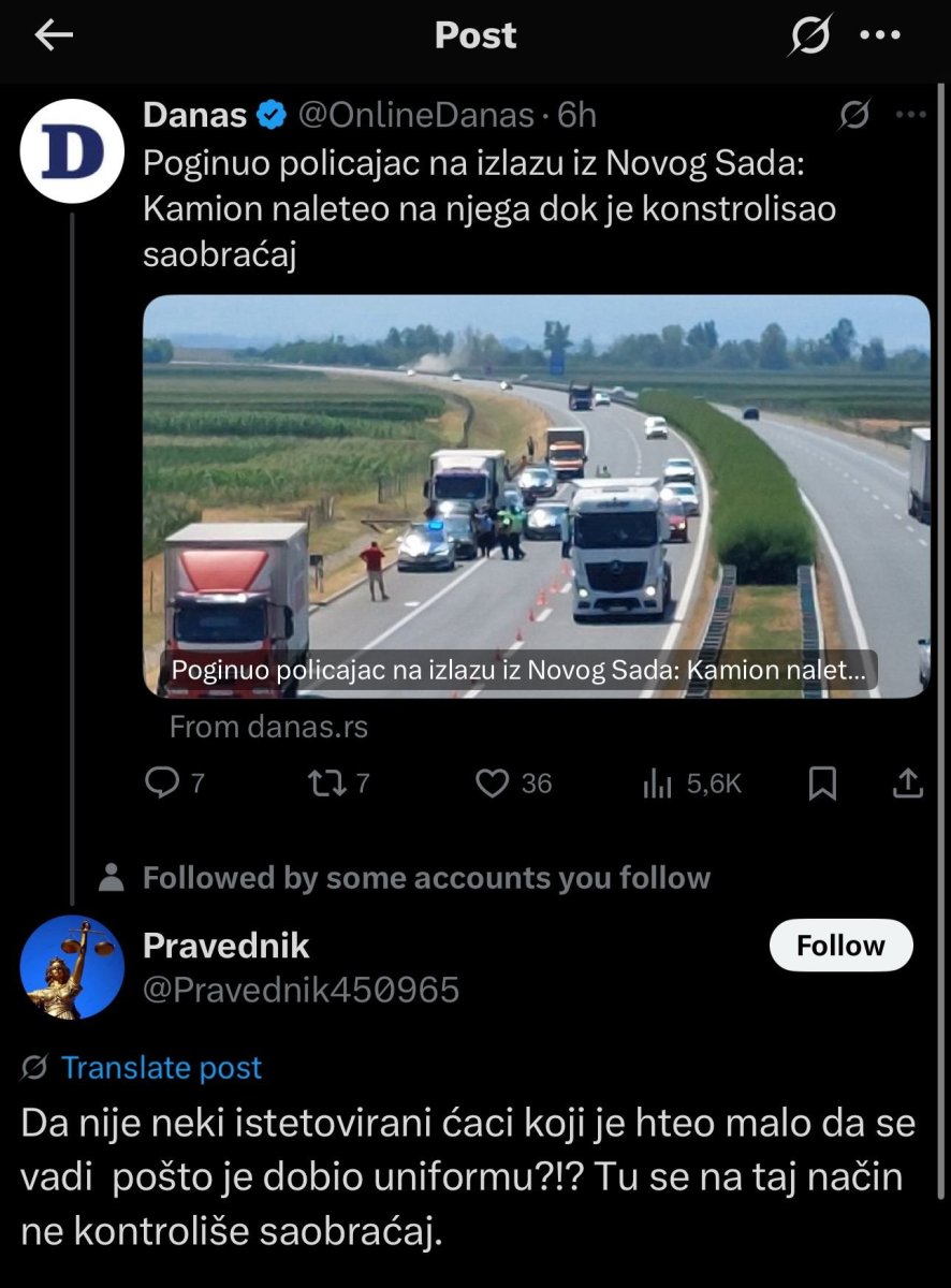 Jedan blokaderski bot na društvenoj mreži X napisao je "odlično" kao komentar na vest da je saobraćajni policajac poginuo u Novom Sadu kada je na njega naleteo kamion.