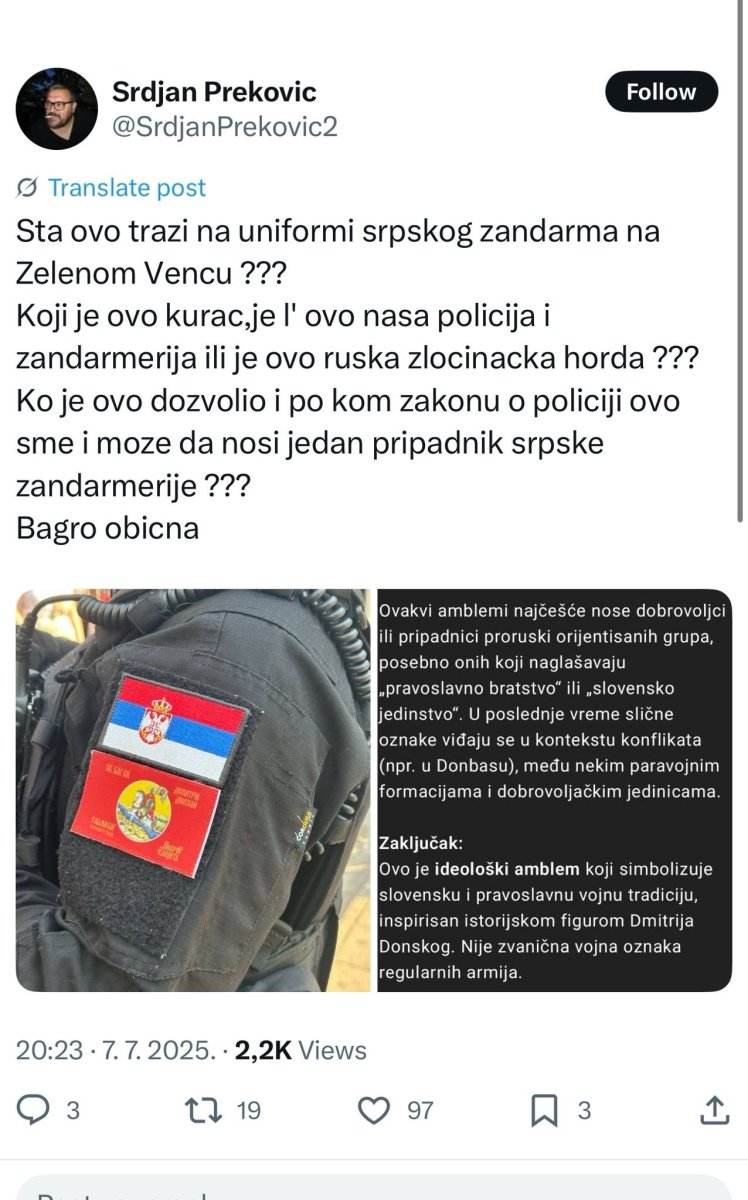 - Šta ovo traži na uniformi srpskog žandarma na Zelenom vencu? Koji je ovo k****, je l' ovo naša policija ili je ovo ruska zločinačka horda? Ko je ovo dozvolio i po kom zakonu ovo može da nosi pripadnik srpske žandarmerij. Bagro - napisao je on na "Iksu".