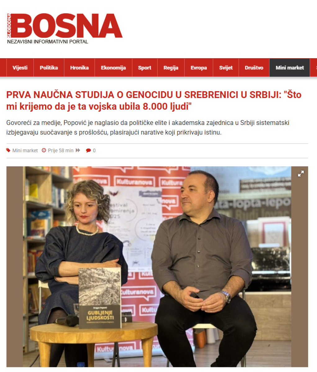 Na ovakav zaključak upućuje i pisanje džihadističke Slobodne Bosne, koja je predstavila knjigu blokaderskog istoričara Dragana Popovića pod naslovom „Gubljenje ljudskosti - Srebrenica kao istorijska činjenica".
