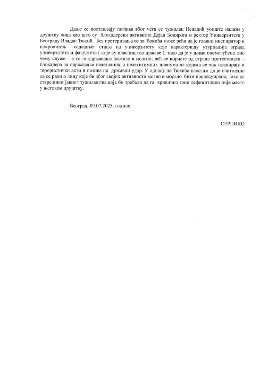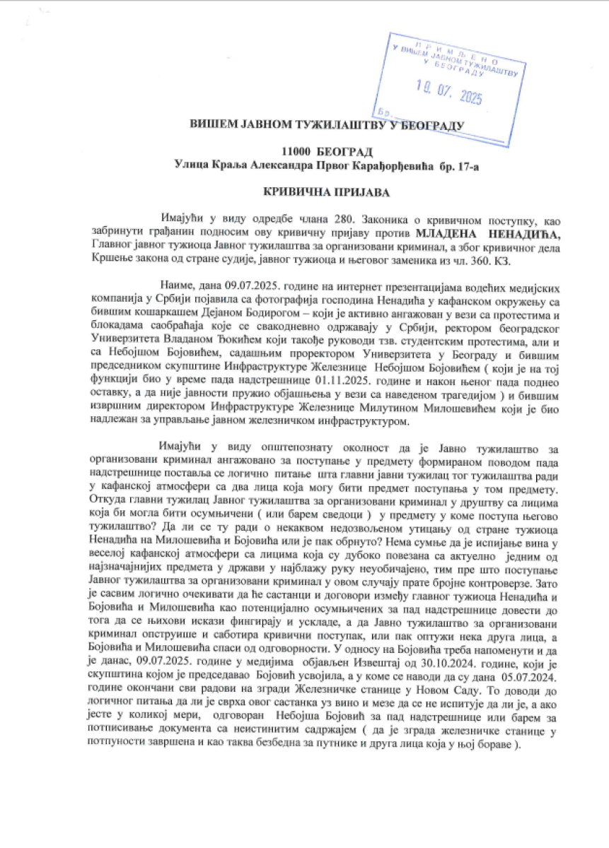 Podsećamo, Nenadić je fotografisan pre neko veče u poznatom beogradskom restoranu u društvu vođa blokadera, među kojima je i Nebojša Bojović, prorektor Beogradskog univerziteta koji je stavio potpis da su svi radovi na rekonstrukciji zgrade Železničke stanice u Novom Sadu završeni do 5. jula 2024. godine, uključujući i nadstrešnicu.