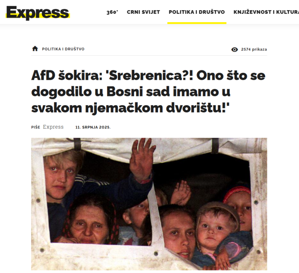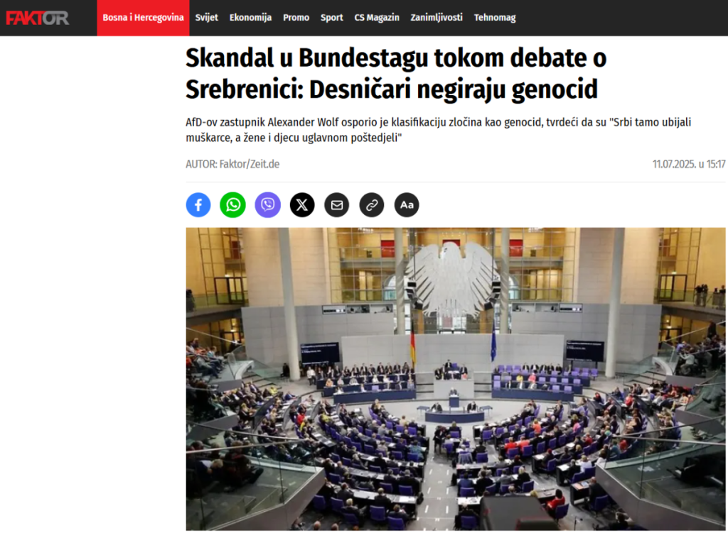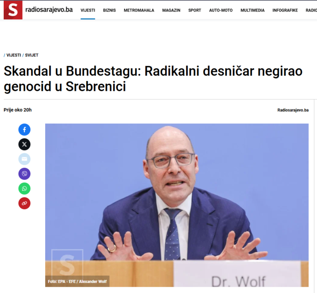Poslanik najveće parlamentarne partije AFD Aleksandrer Volf održao je govor koji sasvim sigurno odjekunuo u glavama sponzora narativa o genocidu u Srebrenici.