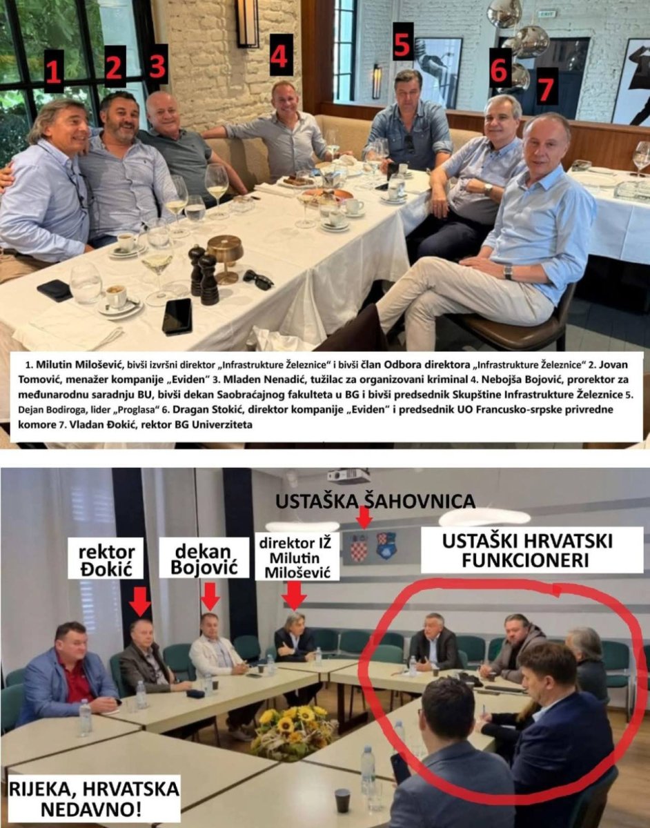 - Da podsetim, grupa od 11 studenata blokadera je terorizam planirala i razmatrala u prostorijama parlamentarne stranke PSG, u Novom Sadu, a ne u kafani. A "Danas" ćuti o trećem događaju, fotografiji, koji se takođe nije desio u kafani, već u Hrvatskoj, u prostorijama zvaničnih državnih organa, gde su rektor Ðokić, i čelnici Infrastrukture Železnice, Nebojša Bojović i Milutin Miloševic, razgovarali sa 6 funkcionera države Hrvatske, od kojih su dvojica bili pripadnici hrvatske obaveštajne službe. O čemu su razgovarali na tajnom sastanku? Da nisu možda planirali rušenje nadstrešnice? Možda će toaletoid Danas i ovo da proglasi "kafanskom pričom"? - ističe Bakarec.
