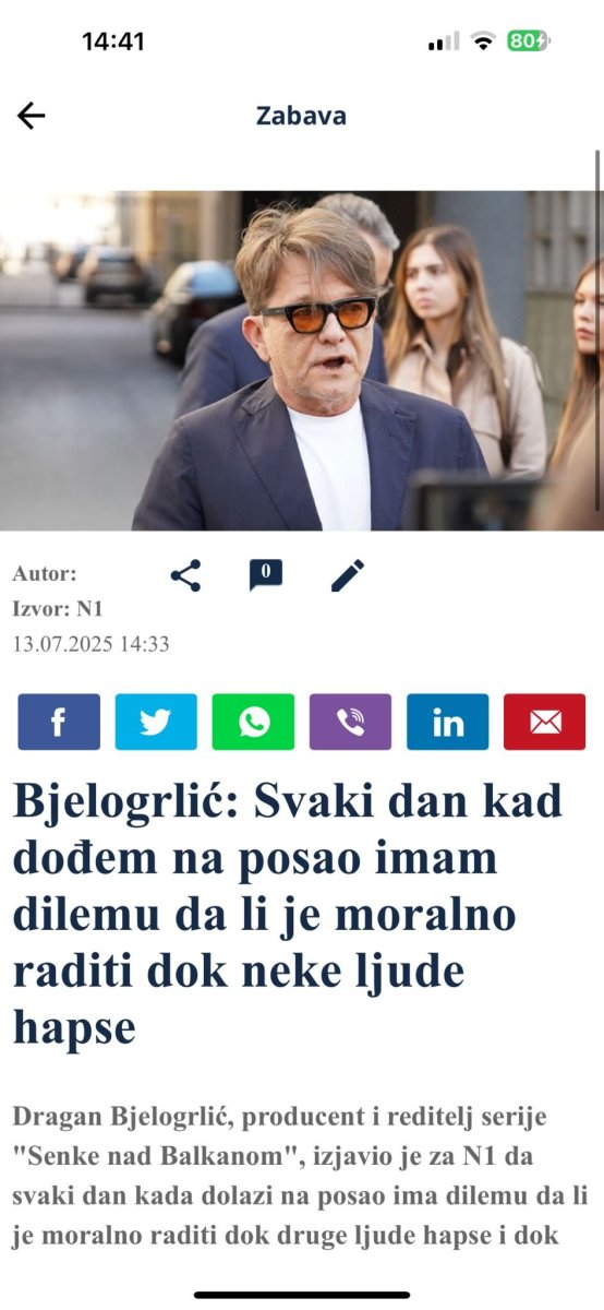 - Moram da kažem da svaki dan kad dođem na posao da radim imam jednu moralnu dilemu - da li je moralno raditi danas dok neke ljude hapse, dok neki ljudi ne primaju platu za svoj posao. I to je težina. Opet, moramo da radimo jer imamo potpisane ugovore, moramo da ispoštujemo rokove za koje smo se obavezali - naveo je Bjelogrlić za tajkunske medije.