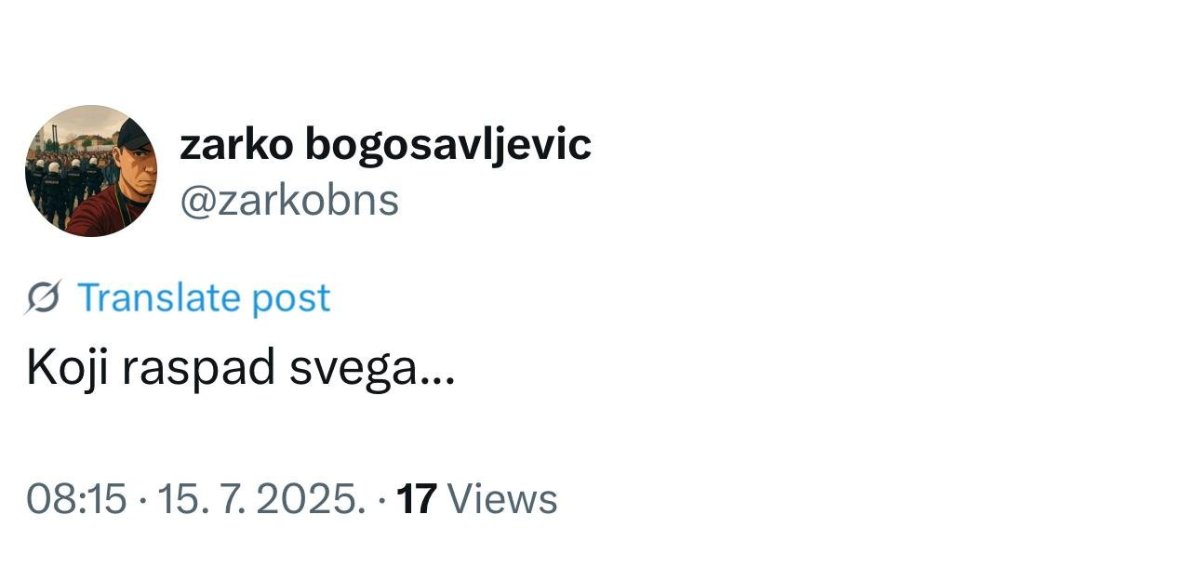 - 08.08h Novosadski sajam... policija (danas obicna bez opreme) obezbedjuje zgradu dok studenti koji zele da uce ulaze da polazu... protestuju neki studenti/gradjani (ne bi komentarisao odziv) - napisao je novinar Žarko Bogosavljević na svom Iks profilu, dok je u drugoj objavi napisao: "Raspad svega".