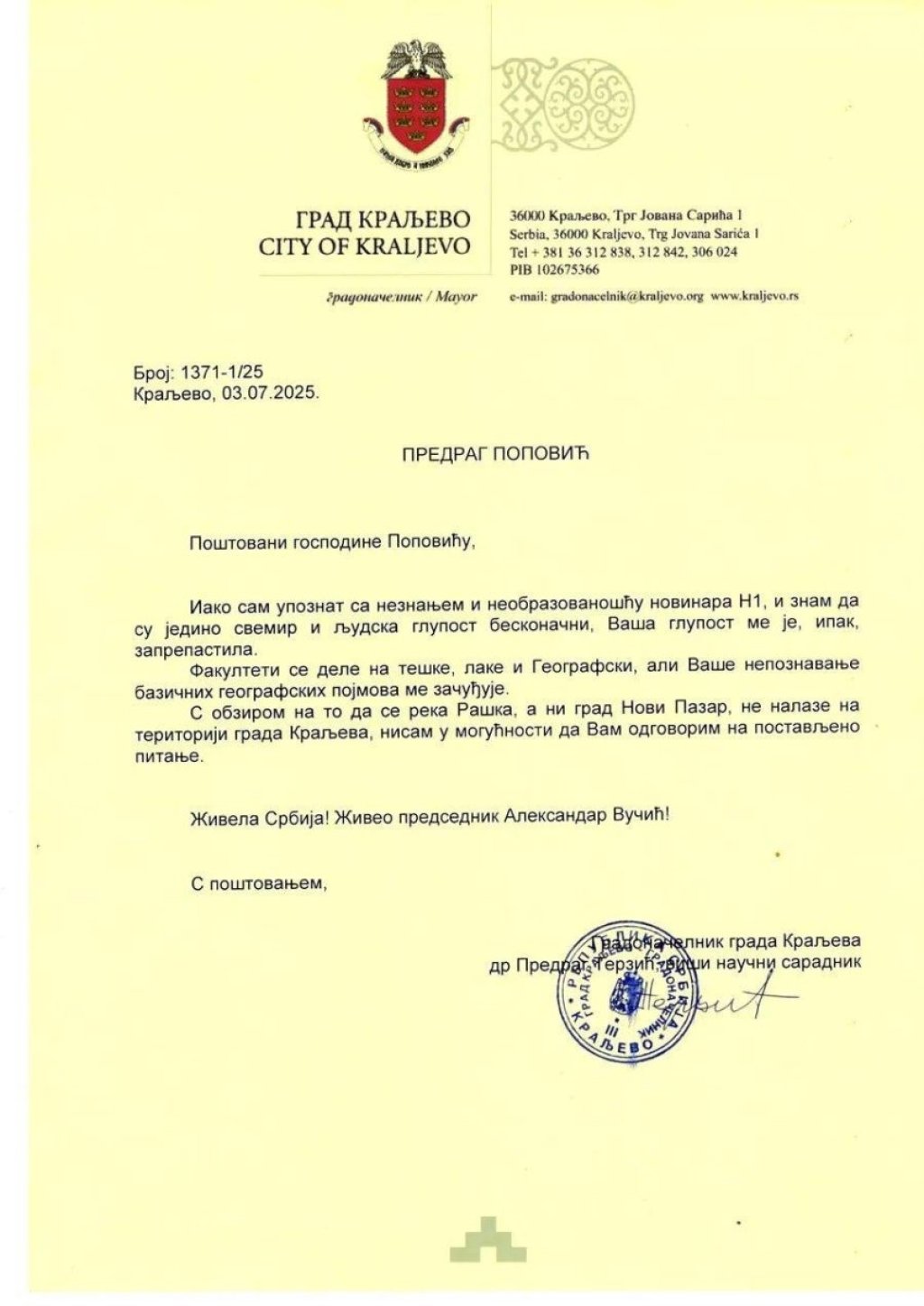 - Iako sam upoznat sa neznanjem i neobrazovanošću novinara N1, a znam da su jedino svemir i ljudska glupost beskonačni, Vaša glupost me je, ipak, zaprepastila. Fakulteti se dele na teške i lake i na Geografski, ali Vaše bazično nepoznavanje geografskih pojmova začuđuje. S obzirom da se reka Raška, a ni grad Novi Pazar ne nalaze na teritoriji grada Kraljeva, nisam u mogućnosti da vam odgovorim na postavljeno pitanje - napisao je gradonačelnik Terzić u odgovoru koji je završio rečenicama: "Živela Srbija! Živeo predsednik Aleksandar Vučić".