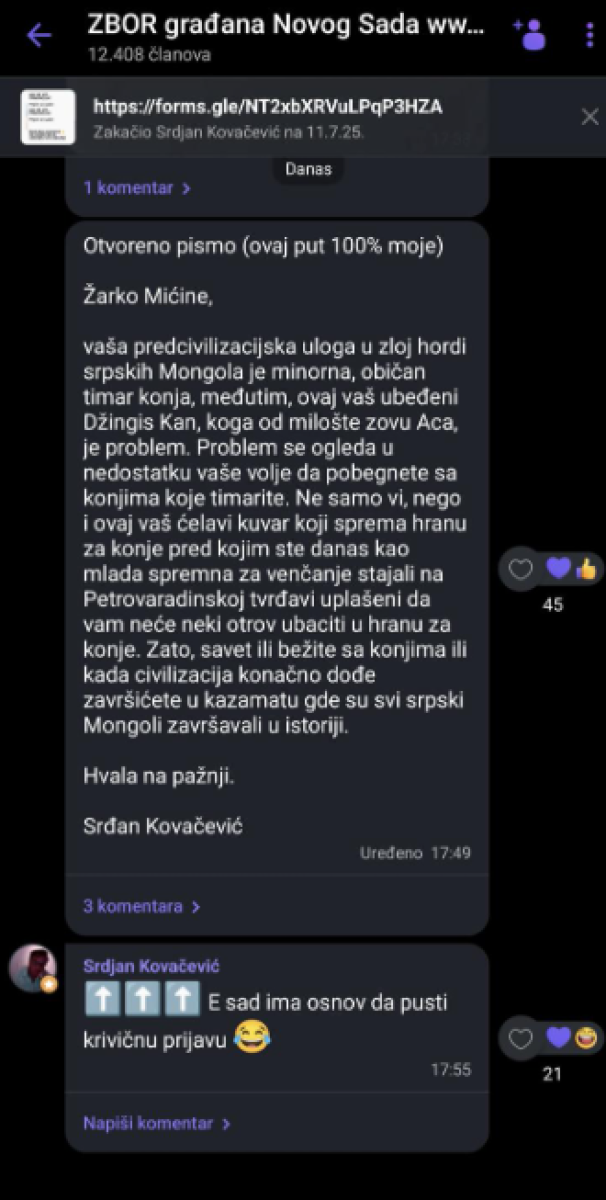 Naime, đilasovac je pismo uputio preko Viber grupe "ZBOR građana Novog Sada" i napisao je da je sto odsto njegovo.