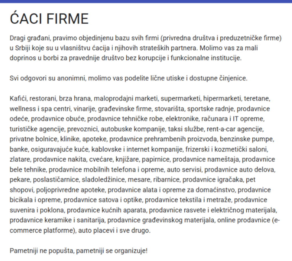 - Dragi građani, pravimo objedinjenu bazu svih firmi (privredna društva i preduzetničke firme) u Srbiji koje su vlasništvu Ćacija i njihovih strateških partnera - stroji u proglasu zgubidana.