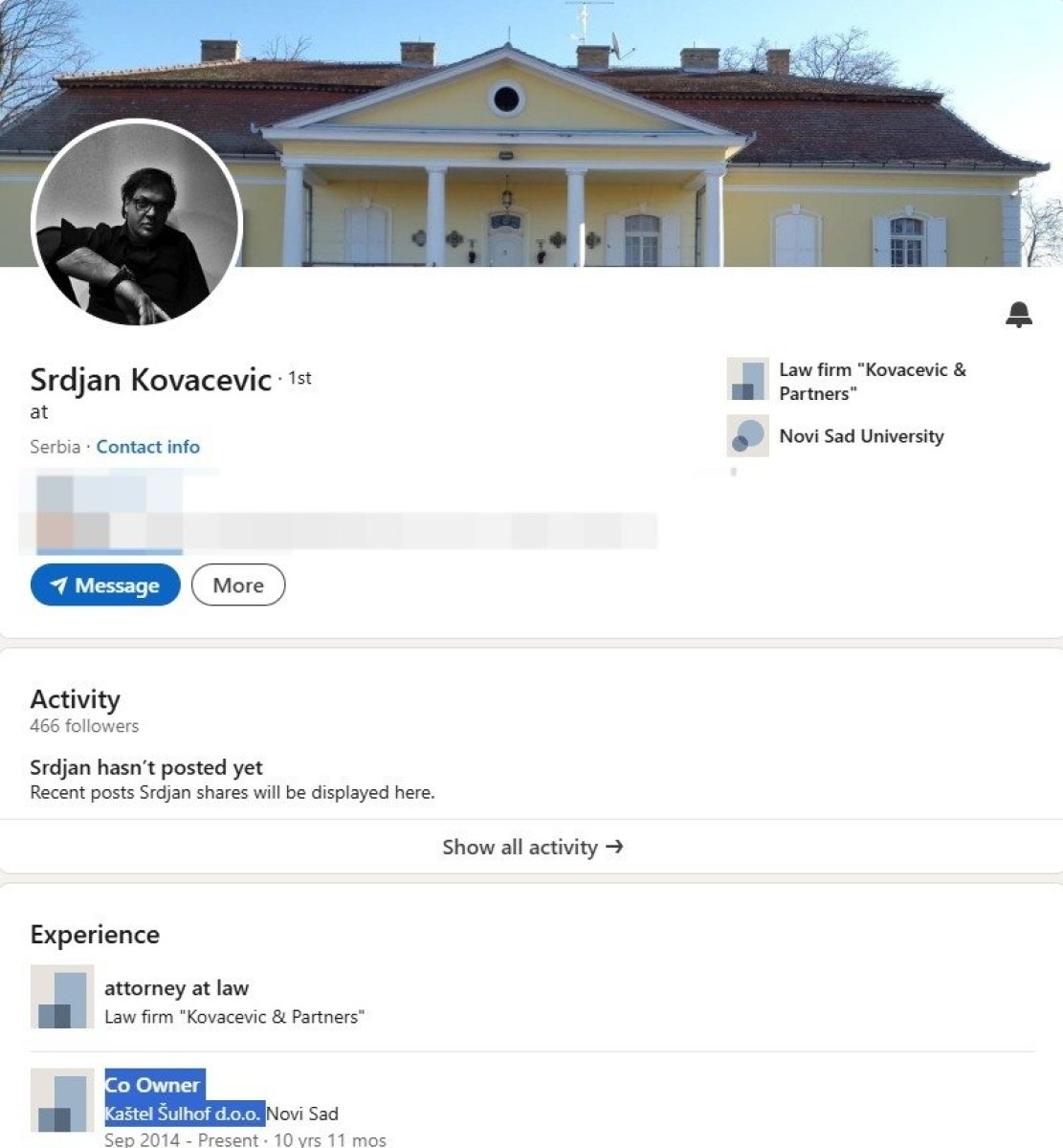 Đilasov advokat Srđan Kovačević suvlasnik je (50 odsto) luksuznog dvorca "Kaštel Schulhoff" koji se nalazi u mestu Padej u Vojvodini.