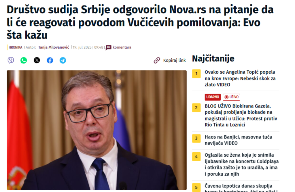 Ovim povodom, naime, oglasilo se Društvo sudija Srbije i kritikovalo odluku šefa države, poručujući da bi Vučić zvanično trebalo da navede i razloge za takve odluke.
