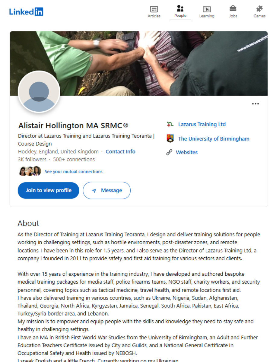 Reč je o Alisteru Džozefu Holingtonu, veteranu britanske vojske, direktoru firme po imenu "Lazarus treining" (engl. Lazarus Training Teoranta) iz Britanije.