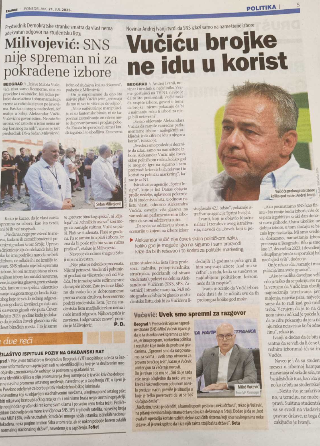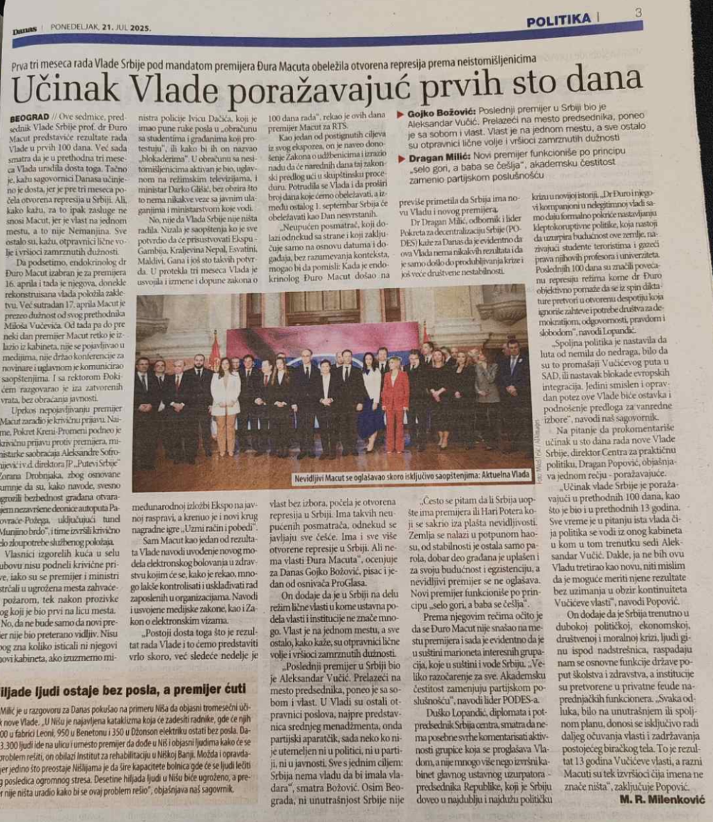 Kao glavna najava štampanog izdanja Danasa od ponedeljka 21. jula plasiran je tekst u kom se tvrdi, bez argumenata, tvrdi da Vlada Srbije u Vučićevoj senci.